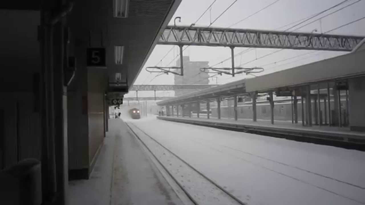 ここは、札幌駅の2つ手前にある、白石駅です。他の列車同様、寝台特急北斗星も雪を撒き散らしながら、全速力で通過します。しかも、他の特急列車が北斗星を追いかけます。