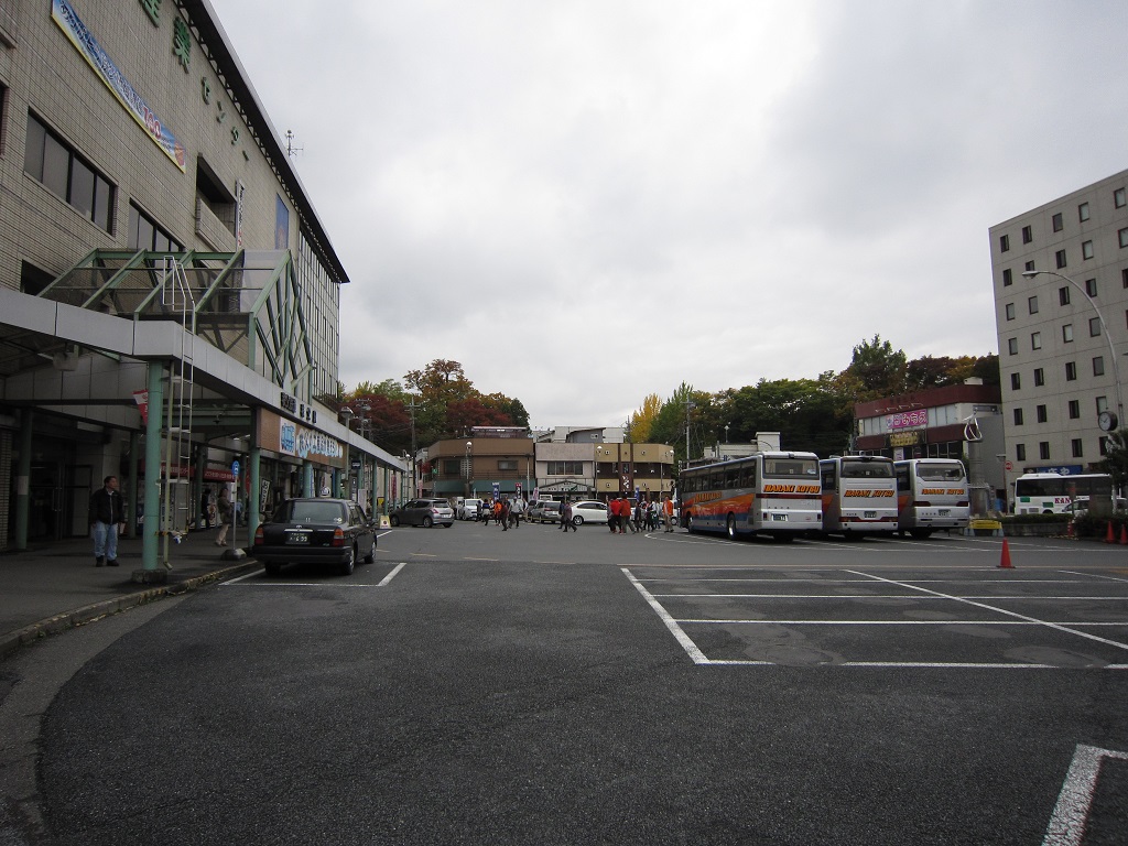 駅前には立派なロータリーがありまして、バスとタクシー乗り場があります。また、お土産物屋さんに立ち寄るためなのか、観光バスも止まります。