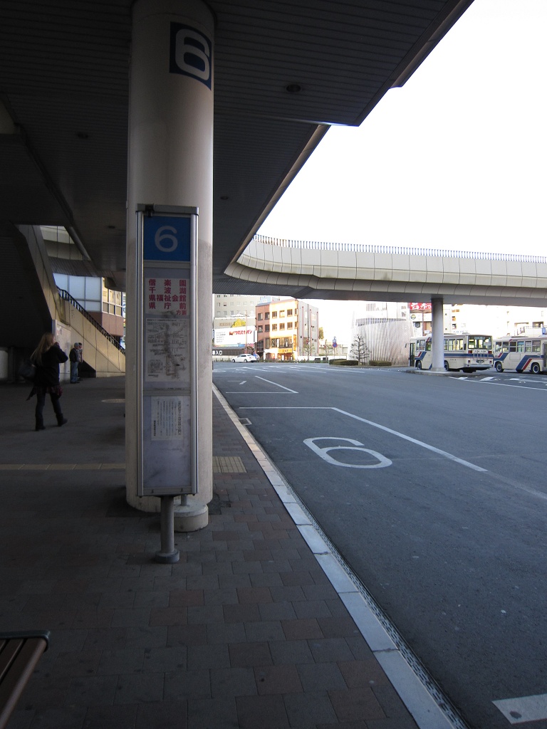 水戸駅からは、水戸駅北口バスターミナルの6番乗り場から、県庁前または県庁前バスターミナルへ行くバスに乗ります。運賃は、大人390円です。おおむね1時間に4本ぐらいのバスが出ていますが、気を付けないといけないのは、この乗り場に来るバスが全部県庁前にいくわけではない、ということです。なので、どのバスに乗ればいいかは行先を見て判断するしかなく(県庁バスターミナル行だったら間違いない)、難易度はかなり高いといえます。