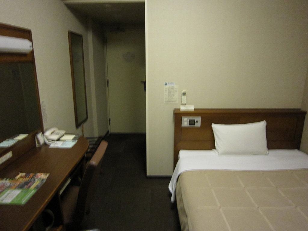 客室内は、大曲駅前のルートインと同じ感じでした。さすがルートイン。しかし、大曲駅前のルートインにはあった、小さなタンスがありませんでした。その代わり、加湿空気清浄機が置いてありました。ま、大曲駅前のルートインも、冬には置いているのかもしれませんが。