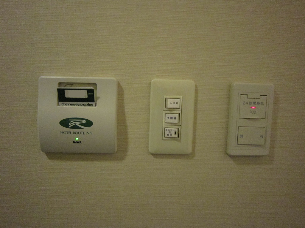 部屋はカードキーで、カードを刺して、抜くと扉の鍵が開く仕組みです。最近のホテルだと一般的な造りとはいえ、この説明がないのが痛いところ。なお、入り口付近にあるボックス(写真の一番左)にカードキーを入れないと、部屋の電気がつかない仕組みになっています。また、24時間換気システムがついているので、換気扇のスイッチはありません。