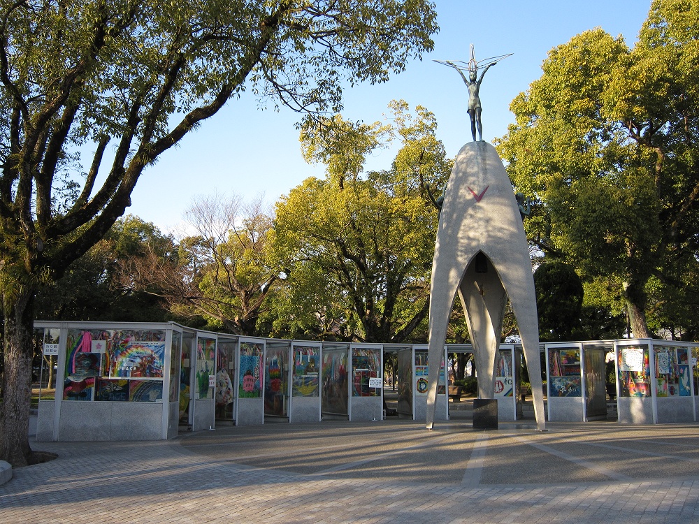 原爆の子の像です。ここには、たくさんの千羽鶴がかかげられています。2歳の時に被爆した佐々木貞子さんが10年後に白血病で亡くなったことをきっかけに、同級生たちが「原爆で亡くなったすべての子供たちのために慰霊碑を作ろう」と呼びかけ、全国の3,200あまりの学校や世界9か国からの寄付などにより、1958年5月5日に完成したそうです。
