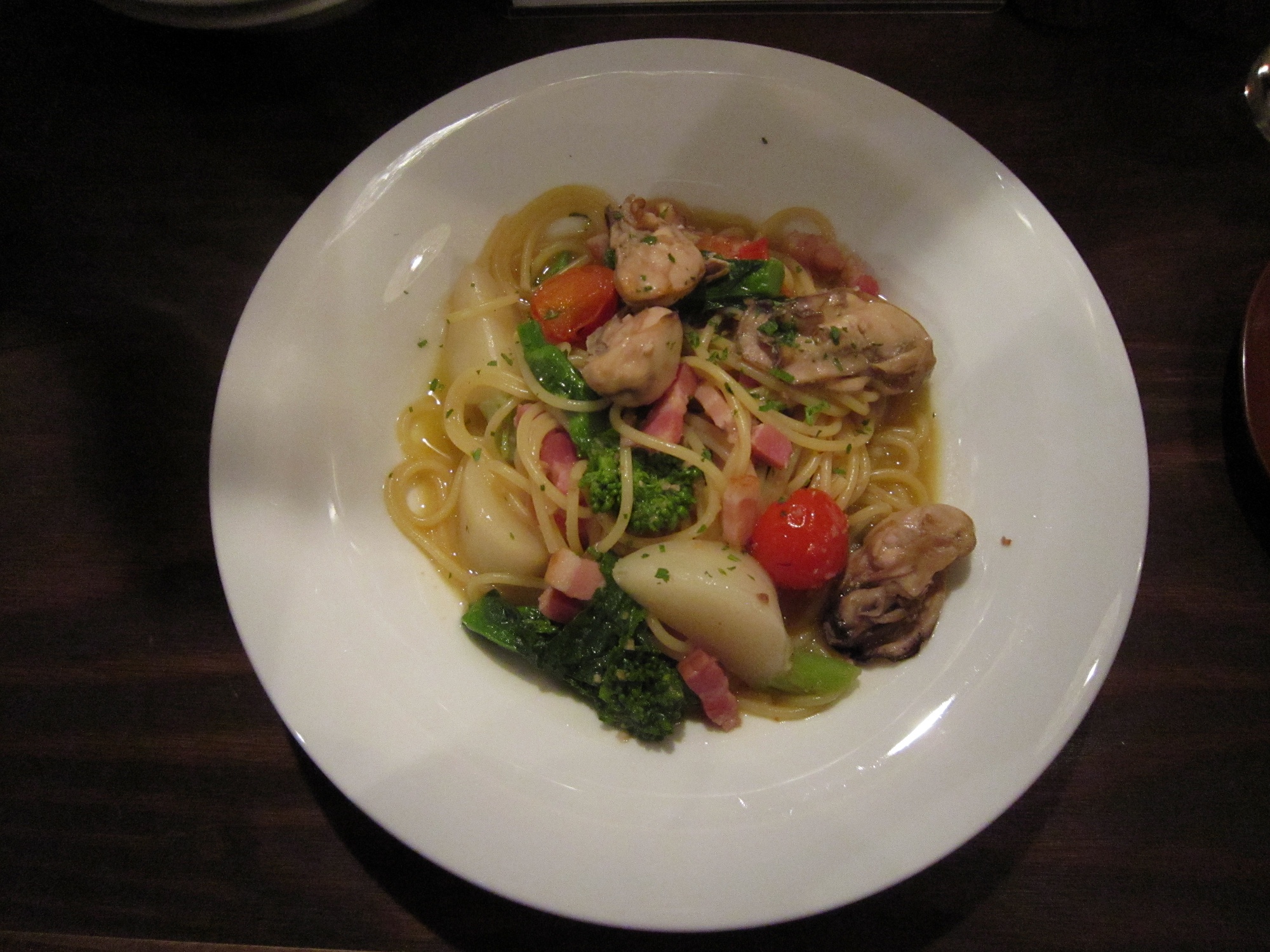 最後に、本日の牡蠣のパスタってメニューがありまして、一体何だろうと聞いてみたらオイル仕立てのパスタだそうで、最後の〆に頼んでみました。牡蠣が5つぐらい入っていて、プチトマトその他お野菜も入っていて、何とも具だくさんのパスタが出てきました。このパスタ、時間が経つごとに牡蠣のエキスを吸い込んでいくみたいで、オイル仕立てだというのに濃厚な味に仕上がっていました。いや、珍しいものをいただきました。