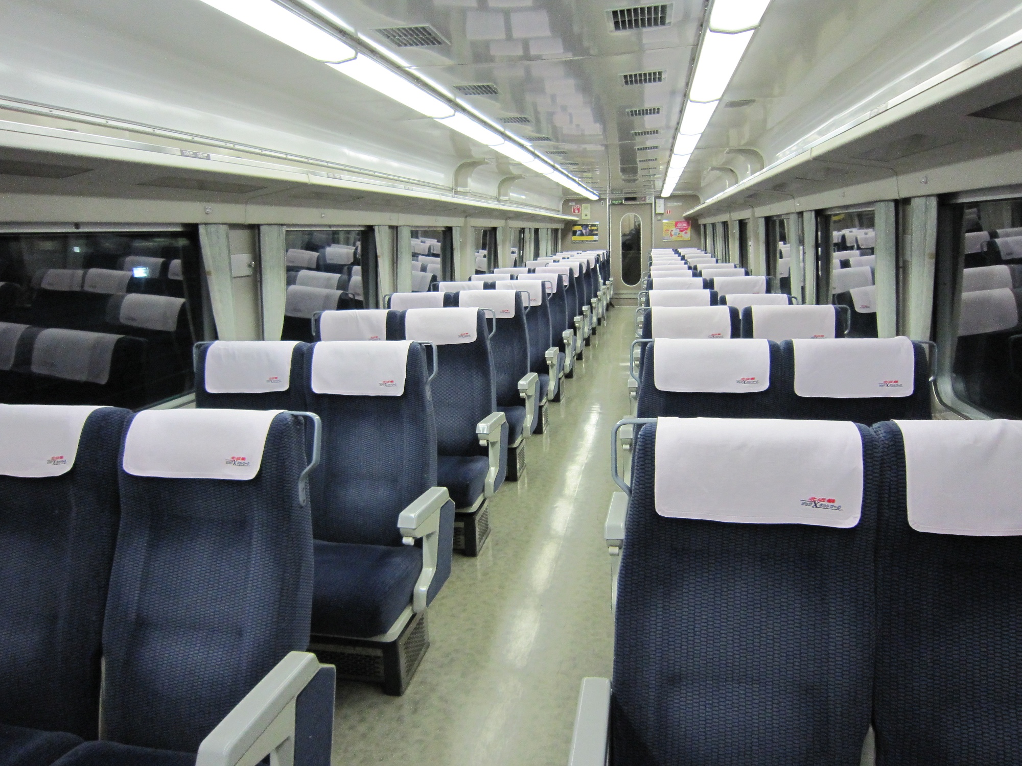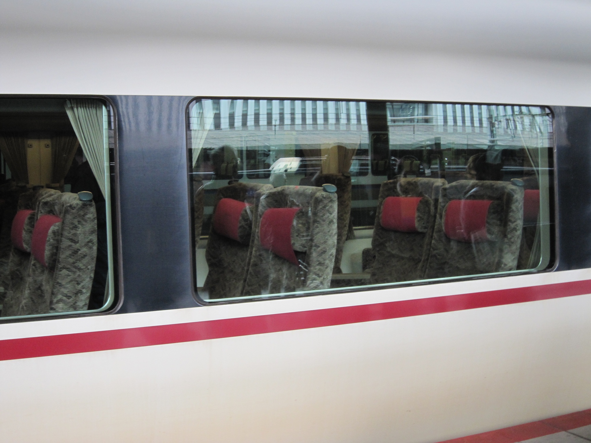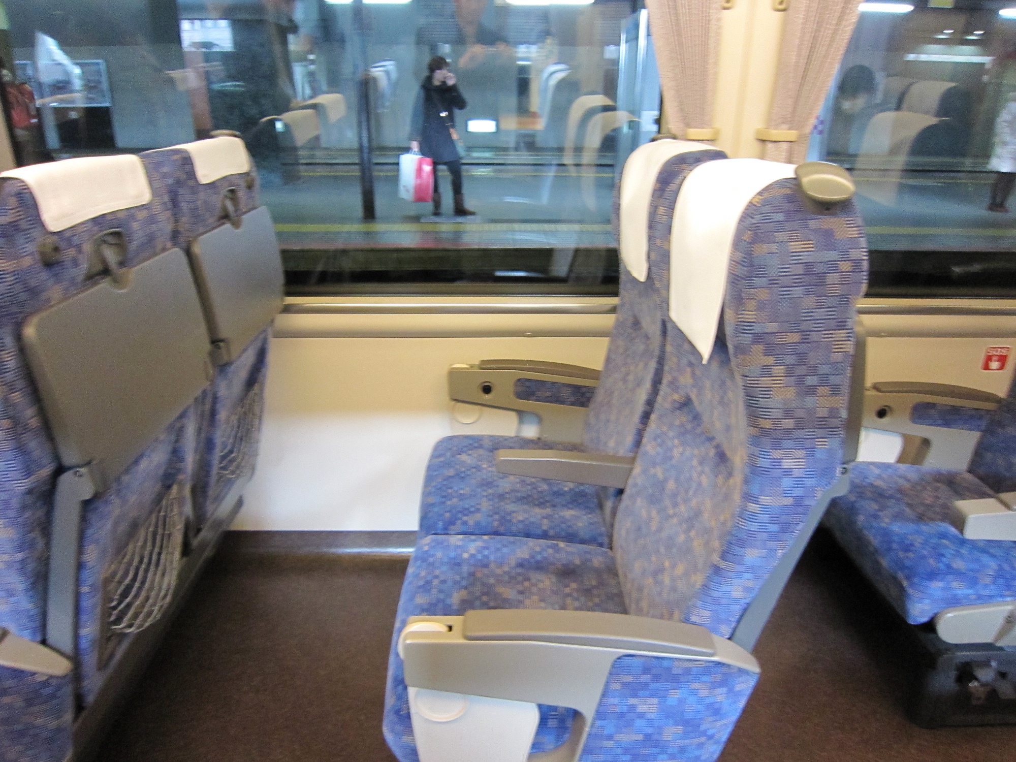 きのさきもこうのとりも、同じ電車を使っています。これは、新しい方の電車です。写真は、グリーン車・・・ていうか、グリーン席(半分がグリーン車で半分が普通車)です。座席は3列で、グリーン車なのに4列でグリーン車料金をぼったくろうとするJR東日本も見習って欲しいです。