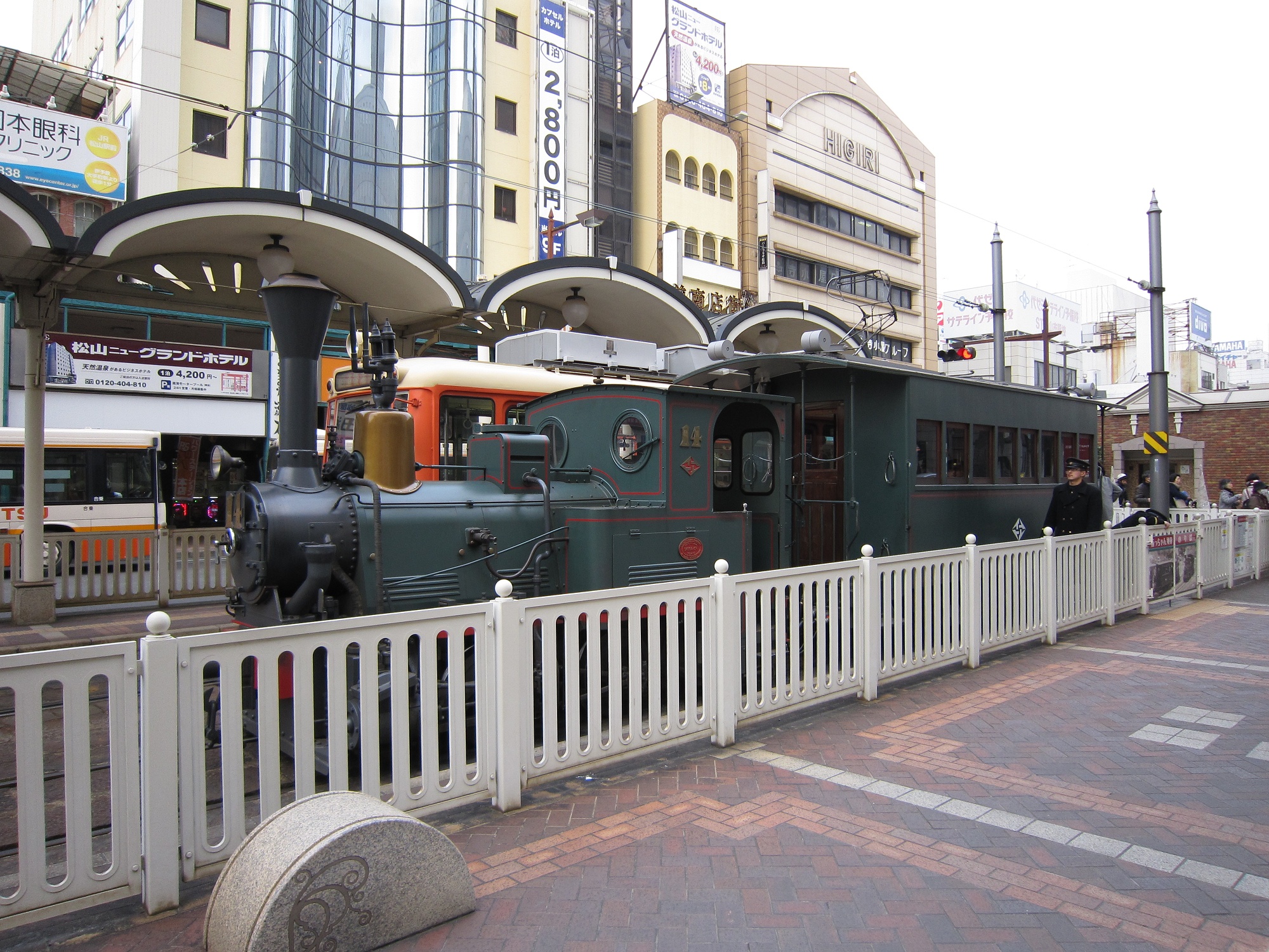 夏目漱石の小説「坊っちゃん」に登場する汽車が、松山市駅のすぐ近くにある、伊予鉄道の本社前にあります。