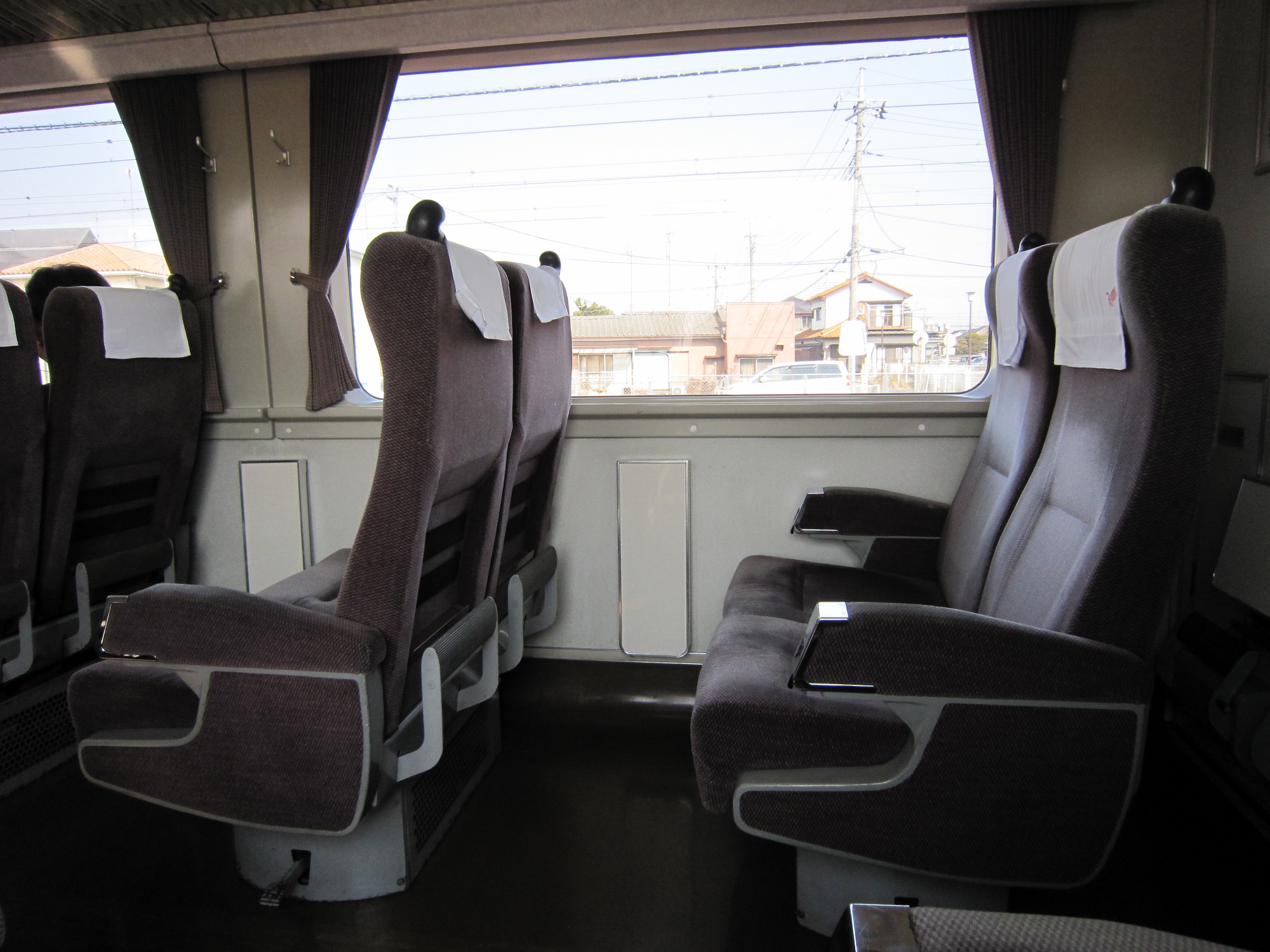 この特急りょうもう。外観はほとんど同じなのに、シートは何パターンかあるみたいです。行きに乗ったのは、このパターンです。ただ、どのパターンでも、跳ね上げ式テーブルとフットレストはついているみたいです。