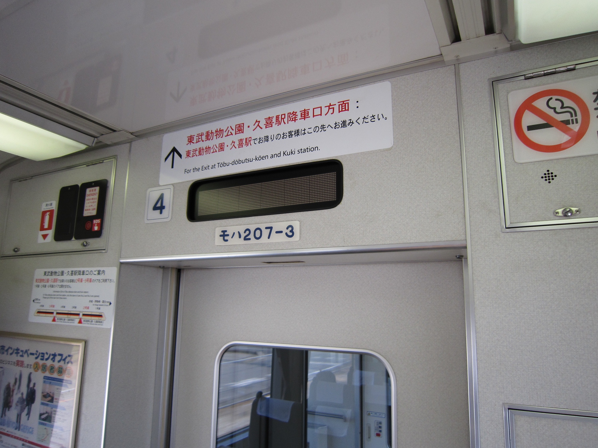 停車駅は、浅草、東京スカイツリー、北千住、東武動物公園、館林、足利、太田、藪塚、新桐生、相老、赤城です。一部のりょうもう号は、羽生、加須、久喜にも止まります。ただし、東武動物公園と久喜では、2号車と5号車のドアしか開きません。なぜかと言うと、この2つの駅は上下線ともに乗り降り両方が発生する可能性があり、ホームの駅員さんが特急券を確認するためです。このため、りょうもう号の扉の上には、案内が書いてあります。
