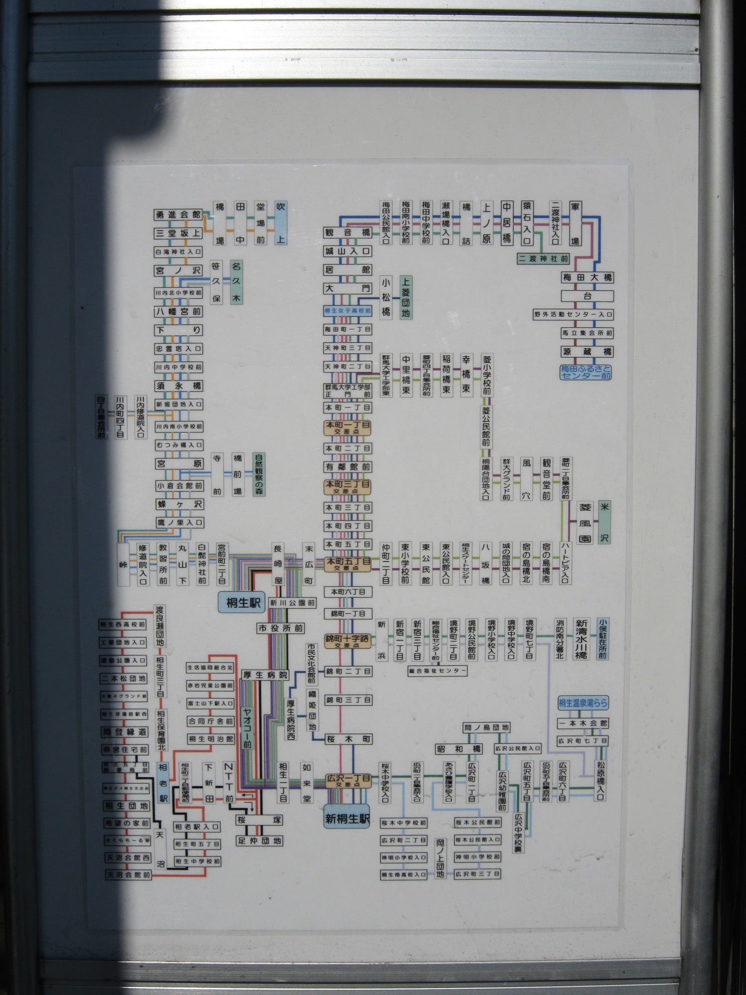 おりひめバスというのは、桐生市内を走るコミュニティバスです。これが、おりひめバスの路線図です。桐生市内各所の他、東武鉄道の新桐生駅へ行くバスもあります。ただし、1時間に1本ぐらいしか出ていないので、時間帯によってはタクシーに乗ることになるかもしれません。ちなみに、新桐生駅まで歩いて20分以上かかるので、徒歩での移動はお勧めできません。
