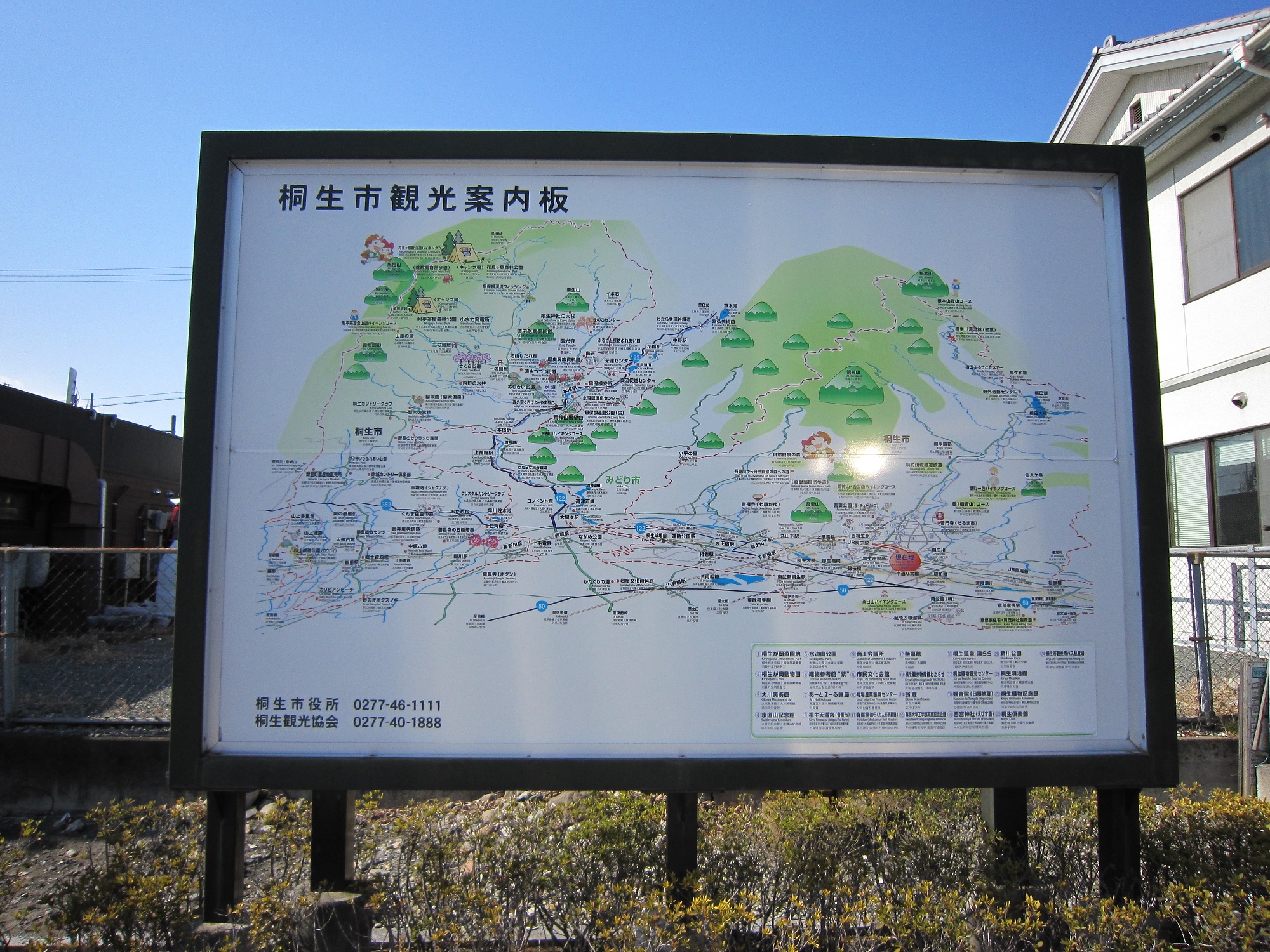 桐生駅北口には、桐生市の観光案内図があります。桐生市内の他、渡良瀬川沿いの地域も載っています。ま、わたらせ渓谷鉄道に乗れば、渡良瀬川に沿って進んでいくわけですが。