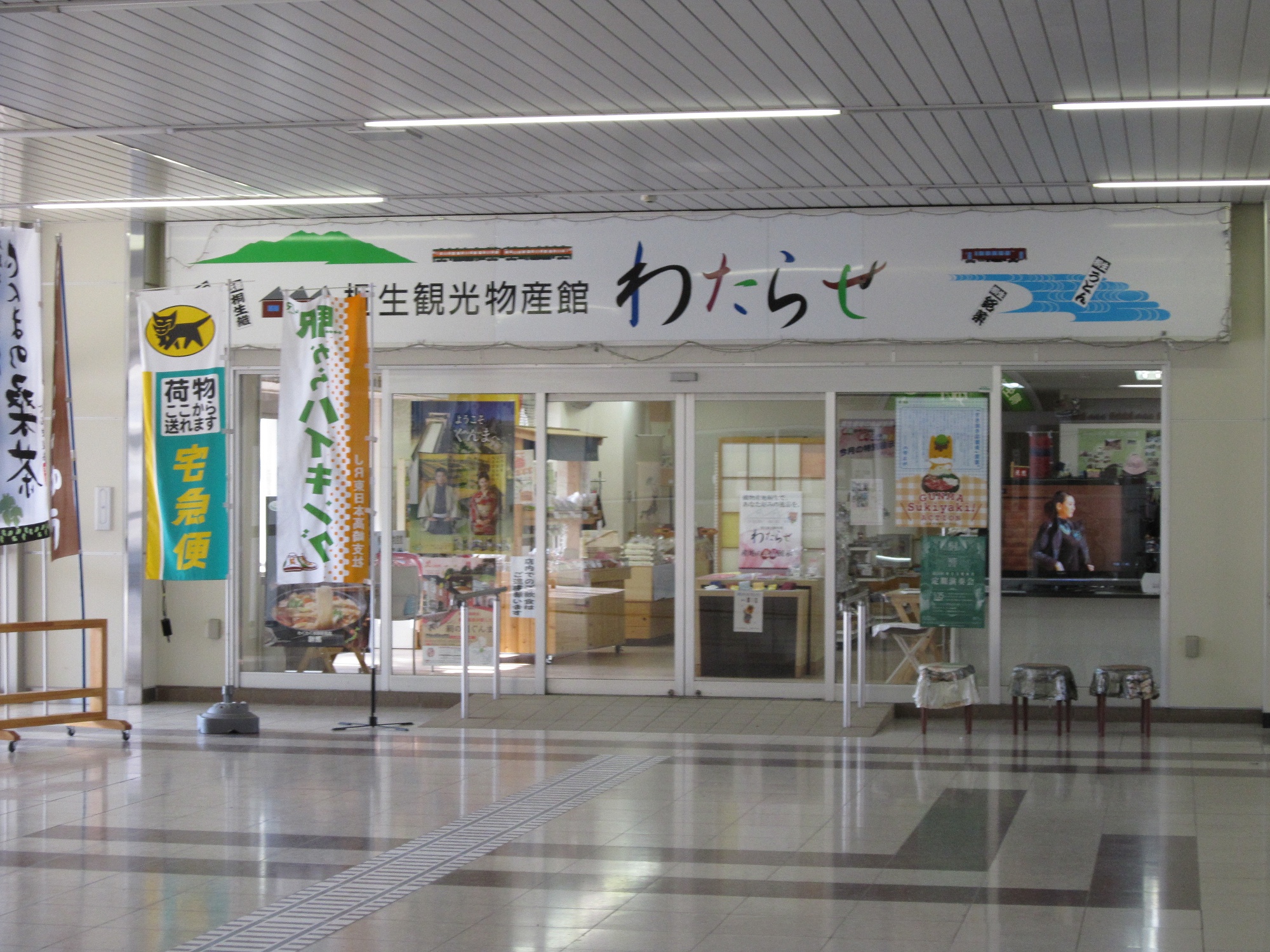 駅構内には立ち食いそば屋さんの他、桐生観光物産館「わたらせ」があります。余談ですが、桐生駅の周辺には、大きさは決して大きくはないものの、神社や仏閣が点在しています。ただし、観光の見どころとして大きいのは、渡良瀬川なのは間違いないでしょう。