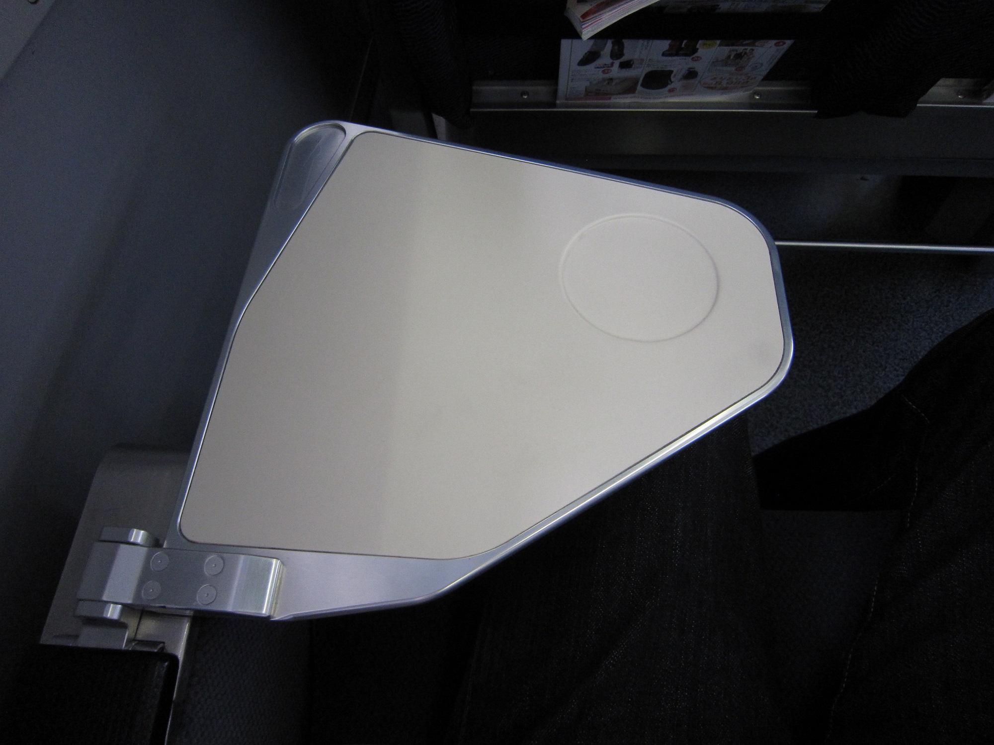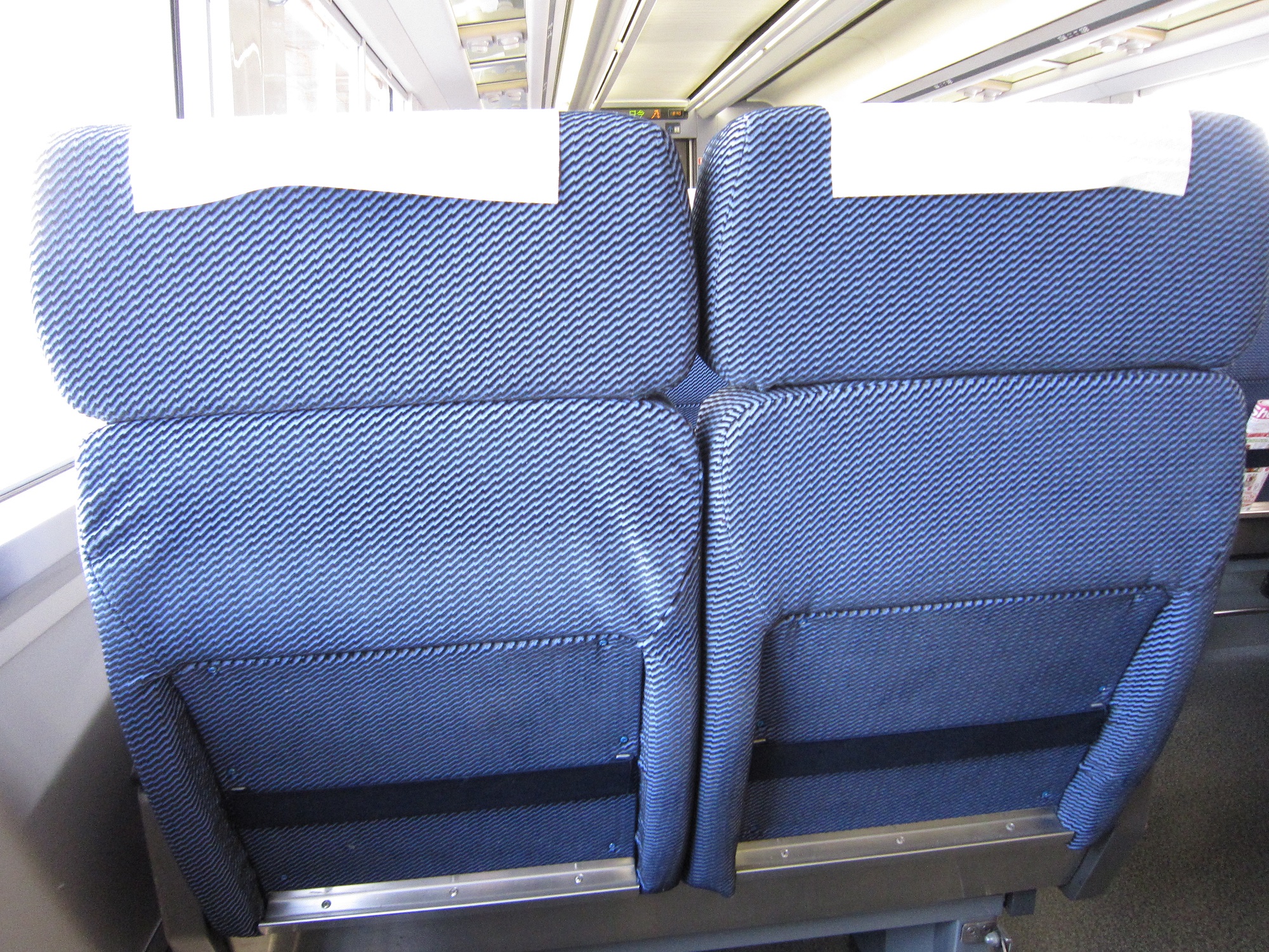 しかし、この座席には欠点がありまして、背面にテーブルがついていません。なぜかと言うと、テーブルは肘掛から出す仕組みになっているからです。肘掛式のテーブルって、座席を向い合わせにしてもテーブルが使えるというメリットがある半面、どうしてもテーブルが小さくなってしまうという欠点もあります。房総特急って海水浴客をはじめとする観光客も乗る半面、ビジネス客も多いはずで、ちょっとこのテーブルはいただけない感じがします。