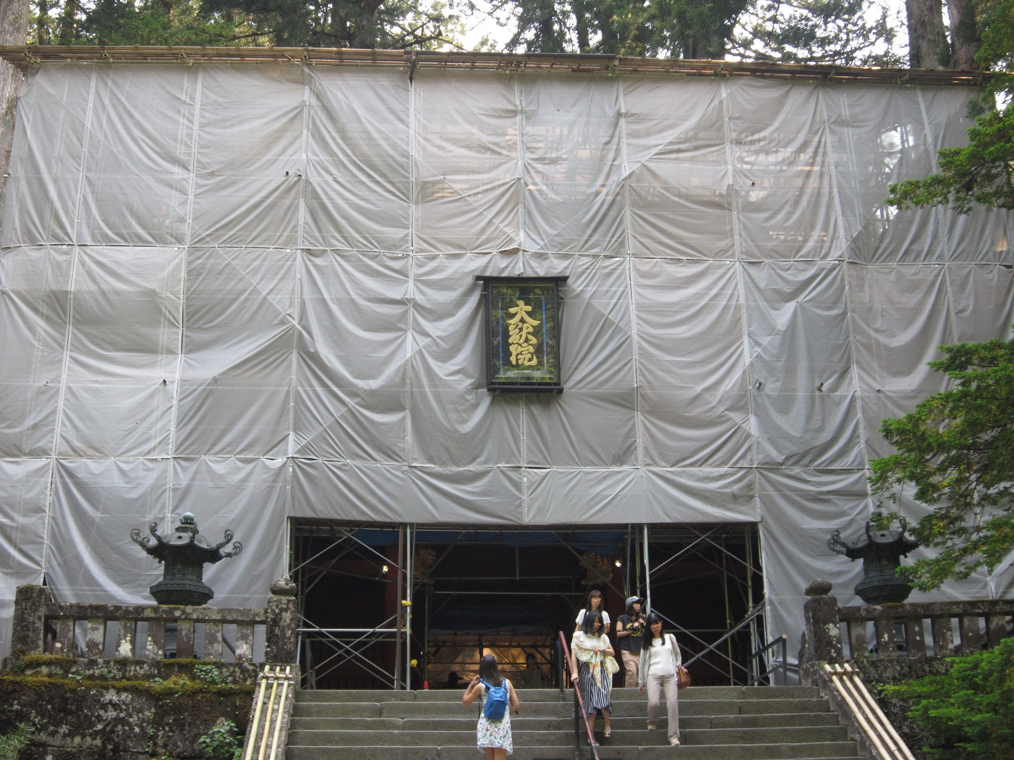 キューティー吉本が昔撮った写真をあさってみると、出てきました。これが工事前の二天門です。辺りが薄暗くなったころに撮ったので、写真が暗くて申し訳ありません。で、二天門の正面の「大猷院」の額だけは、工事中でも見えるのがご愛嬌ですね。