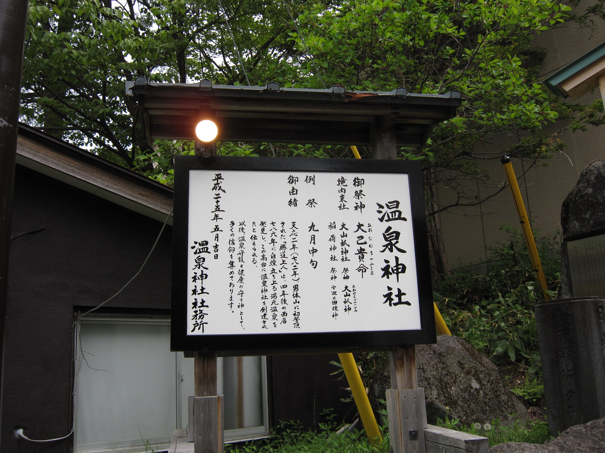温泉神社は、天応2年(782年)に男体山に初登頂された勝道上人が、その4年後の786年に湯元温泉を発見し、この高台に創建されたと伝えられています。同じような話が、日光湯元温泉源泉にも書いてあります。そりゃあそうですよね。湯元温泉をどこで発見したって、源泉で発見したに決まってますからねぇ。