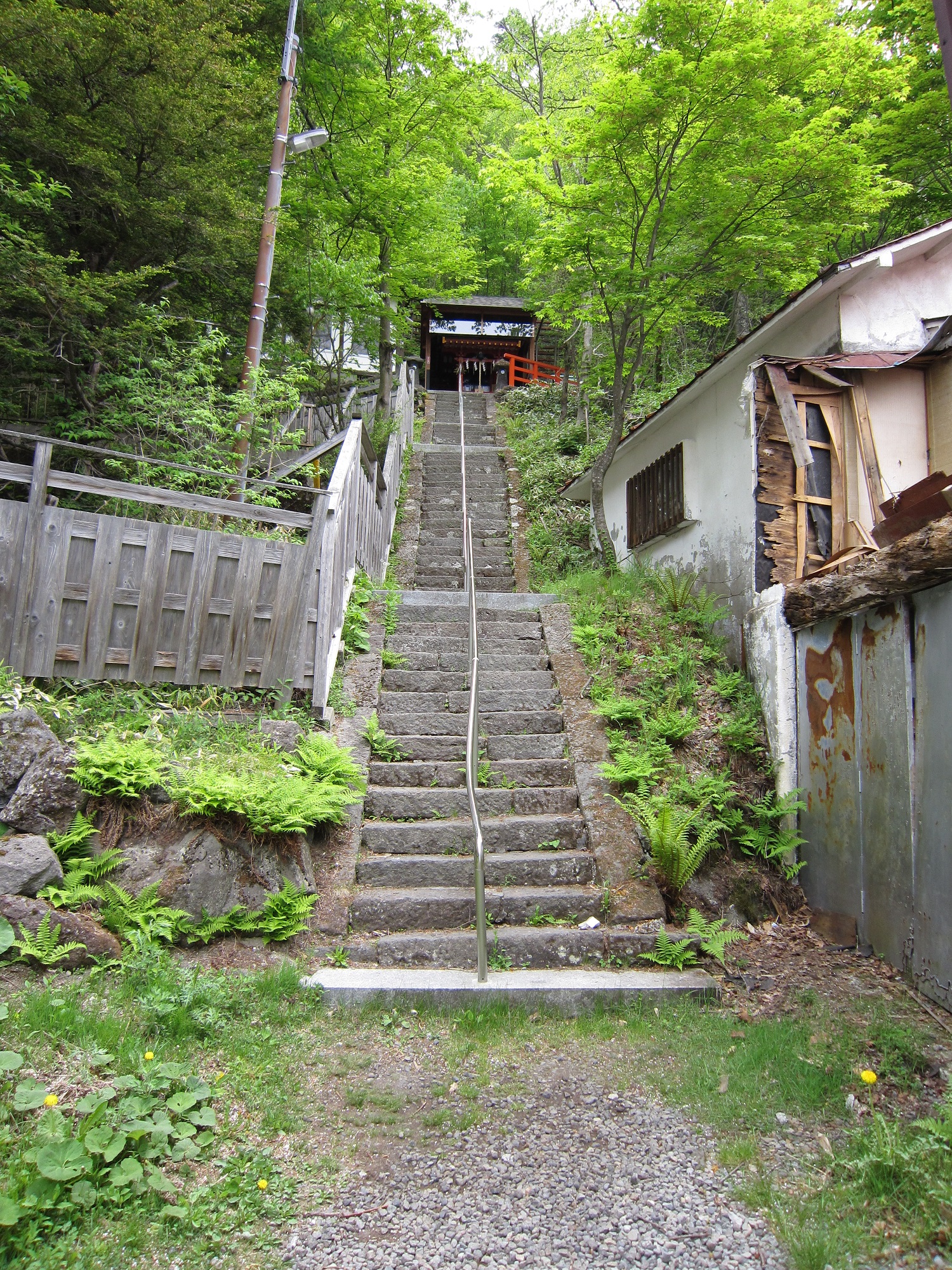 この温泉神社、説明書きの通り高台に建っていまして、かなり急な石段を登らないと行けません。長さはそれほどではないものの、石段の一段一段がかなり高さがあります。また、手すりがゆがんでいるのが気になります。