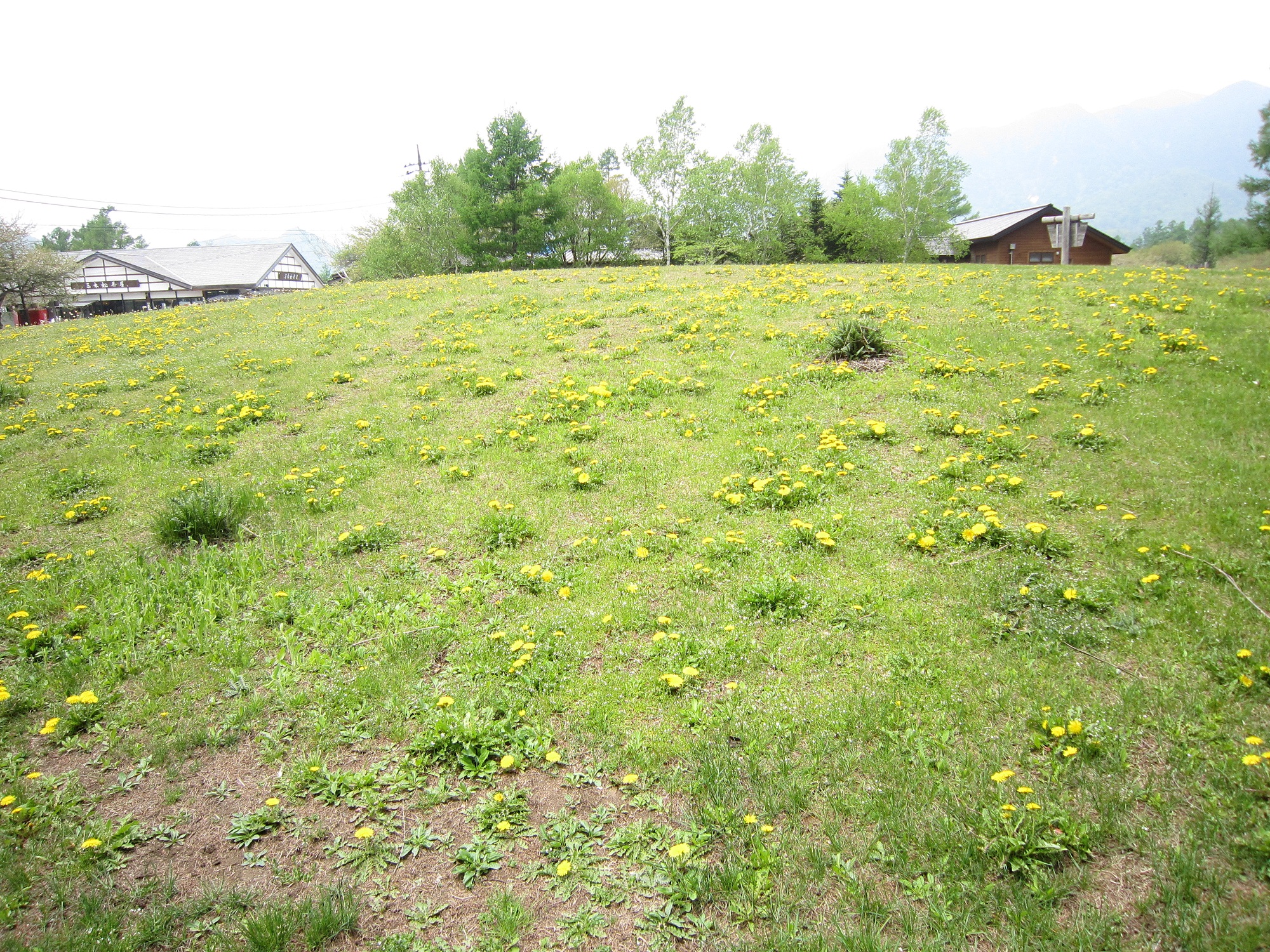 キューティー吉本が行ったのが新緑のシーズンでして、カラマツも去ることながら、タンポポの花が満開で、とってもきれいでした。カラマツ林のすぐ横、お土産物屋さんのすぐ後ろ辺りに小高い丘がありまして、タンポポが一面に咲いていました。