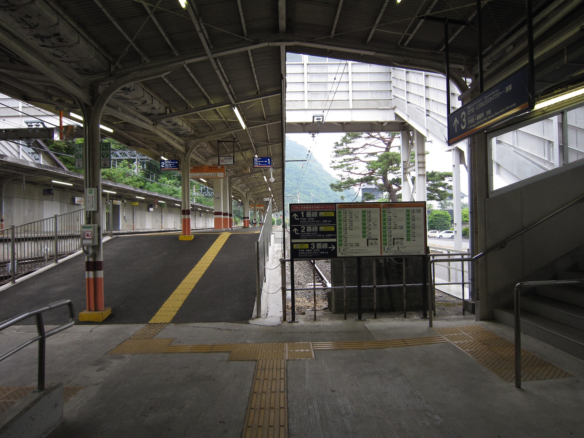 1番線が特急スペーシアをはじめ、鬼怒川公園駅で折り返して浅草方面に行く列車用、2番線が主に新藤原・川治温泉湯西川温泉・会津田島方面行き、3番線が鬼怒川温泉下今市浅草方面行きで、会津田島方面から直通する列車。3番線へは跨線橋を渡ります。しかし、跨線橋への階段が3番線と逆を向いているという、不思議な配置。