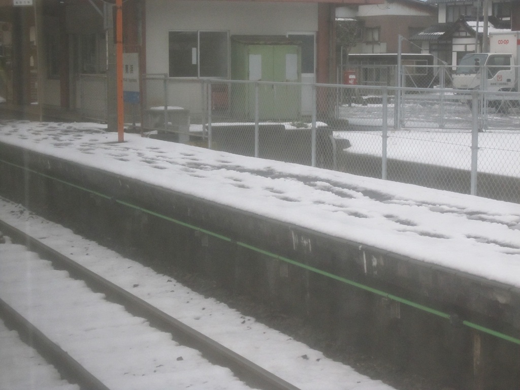 山陰本線完乗の旅は、いよいよ鳥取県に入ります。冬の山陰本線ですから、もちろん雪景色です。ホームにも雪が積もってます。