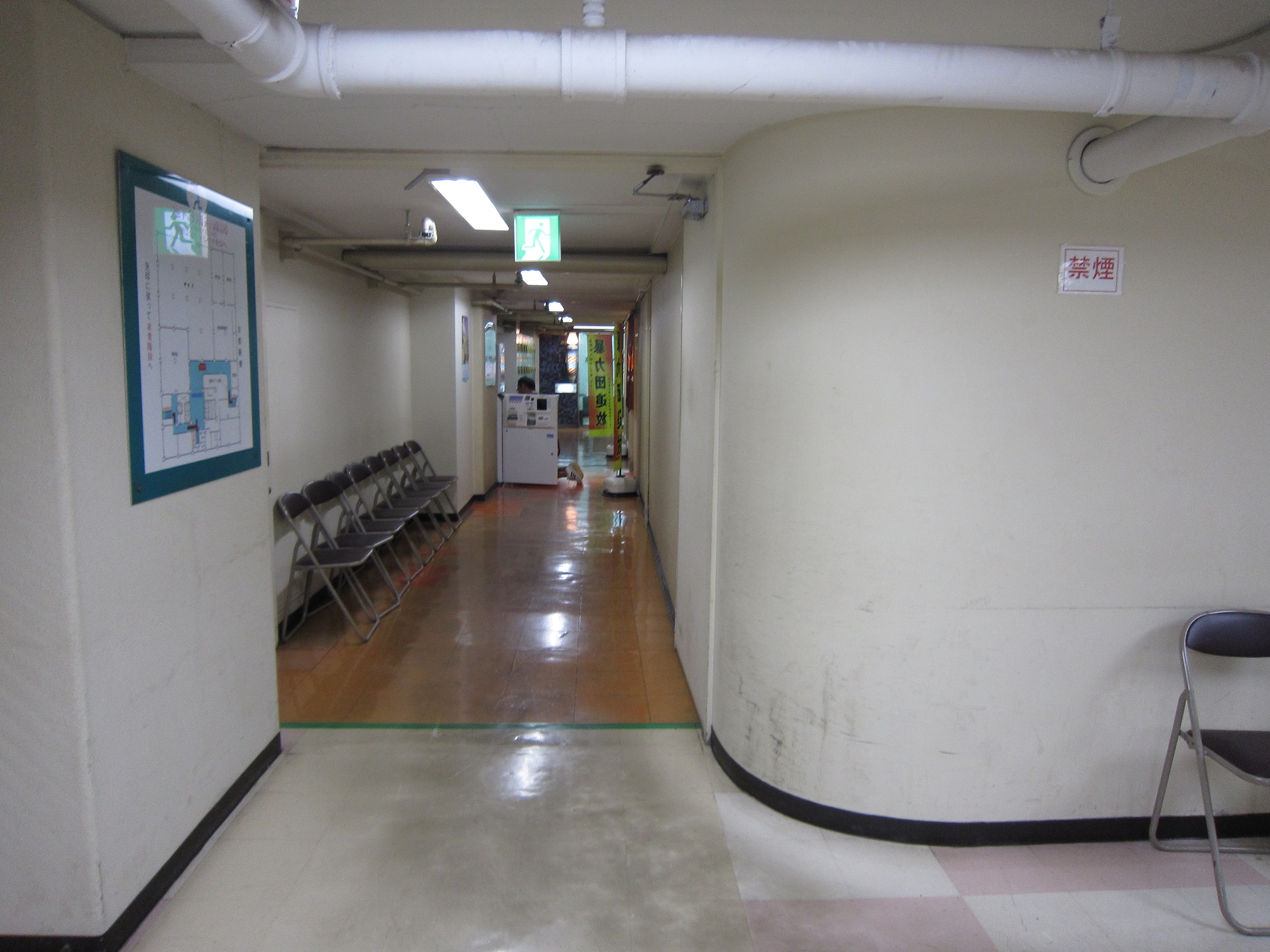 地下3階です。本当にこんなところに日帰り入浴施設があるのかと、半信半疑になりそうな光景が広がります。かまわず、奥へと進みます。