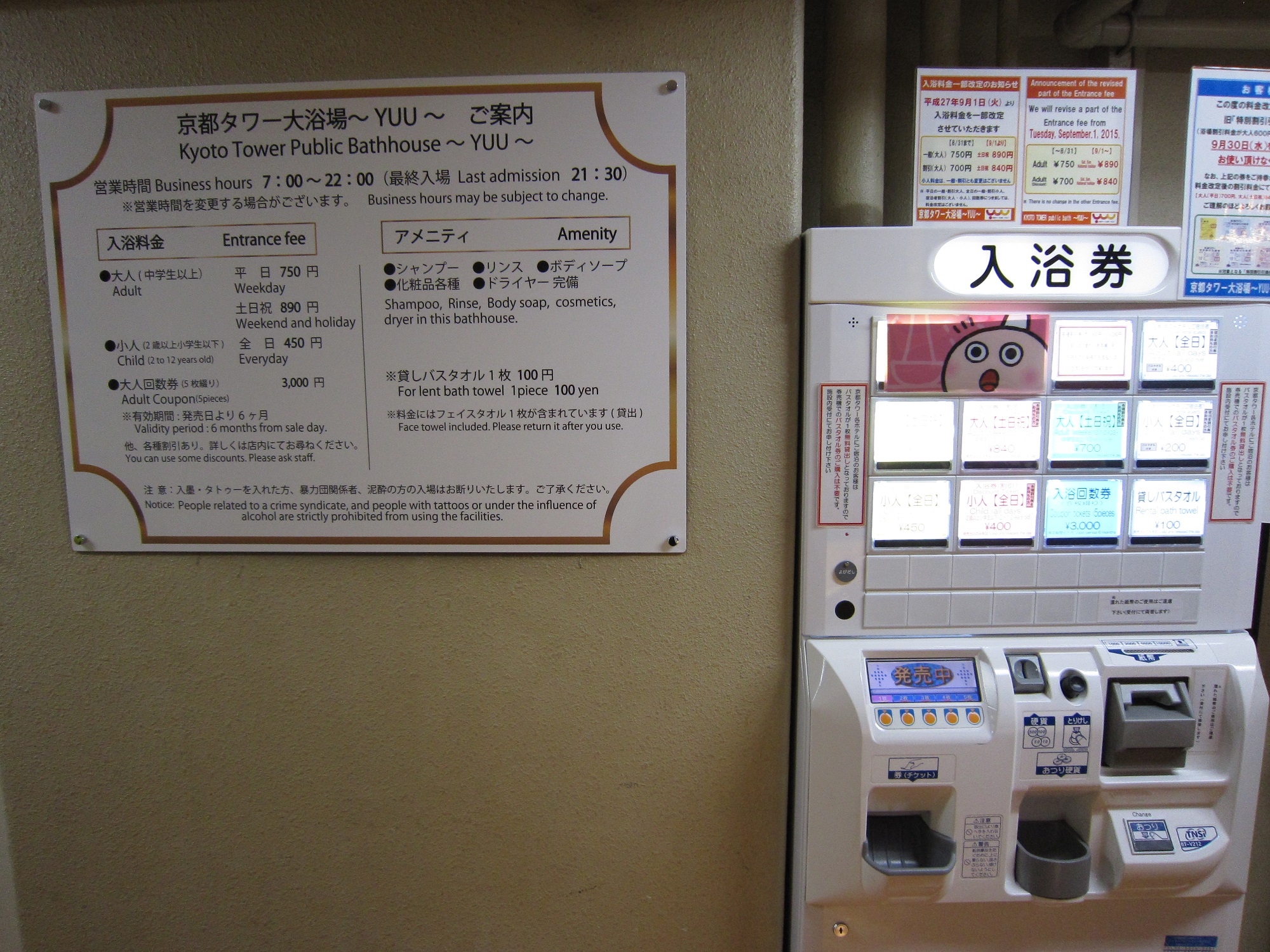 営業時間は、7:00~22:00です。なんで、朝の7時から開いているのかというと、ここが京都駅前だからです。京都駅にはバスターミナルがありまして、ドリーム号をはじめとして夜行高速バスが数多く発着します。夜行バスが京都に到着するのは朝・・・というわけで、夜行バスに乗って京都に来た人が、到着後すぐにお風呂に入れるよう、朝の7時から開いているというわけです。一方で、夜の10時まで開いているので、夜行バスの出発前の入浴もできるわけです。キューティー吉本が京都タワーホテルに泊まった時、朝の時間帯に行ってみたのですが、結構混んでました。やはり朝の時間帯にバスで京都に来た人のニーズは少なからずあるみたいです。