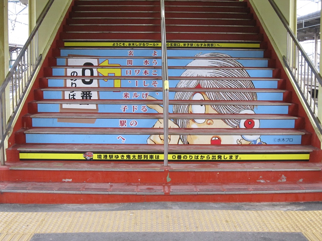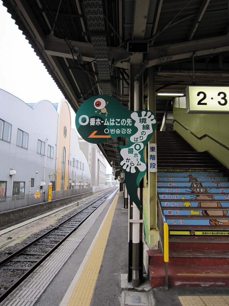 さて、この写真はというと、米子駅って水木しげるワールドになっていて、境線乗り場への案内も、ゲゲゲの喜太郎です。あれ、漢字合ってるかな?