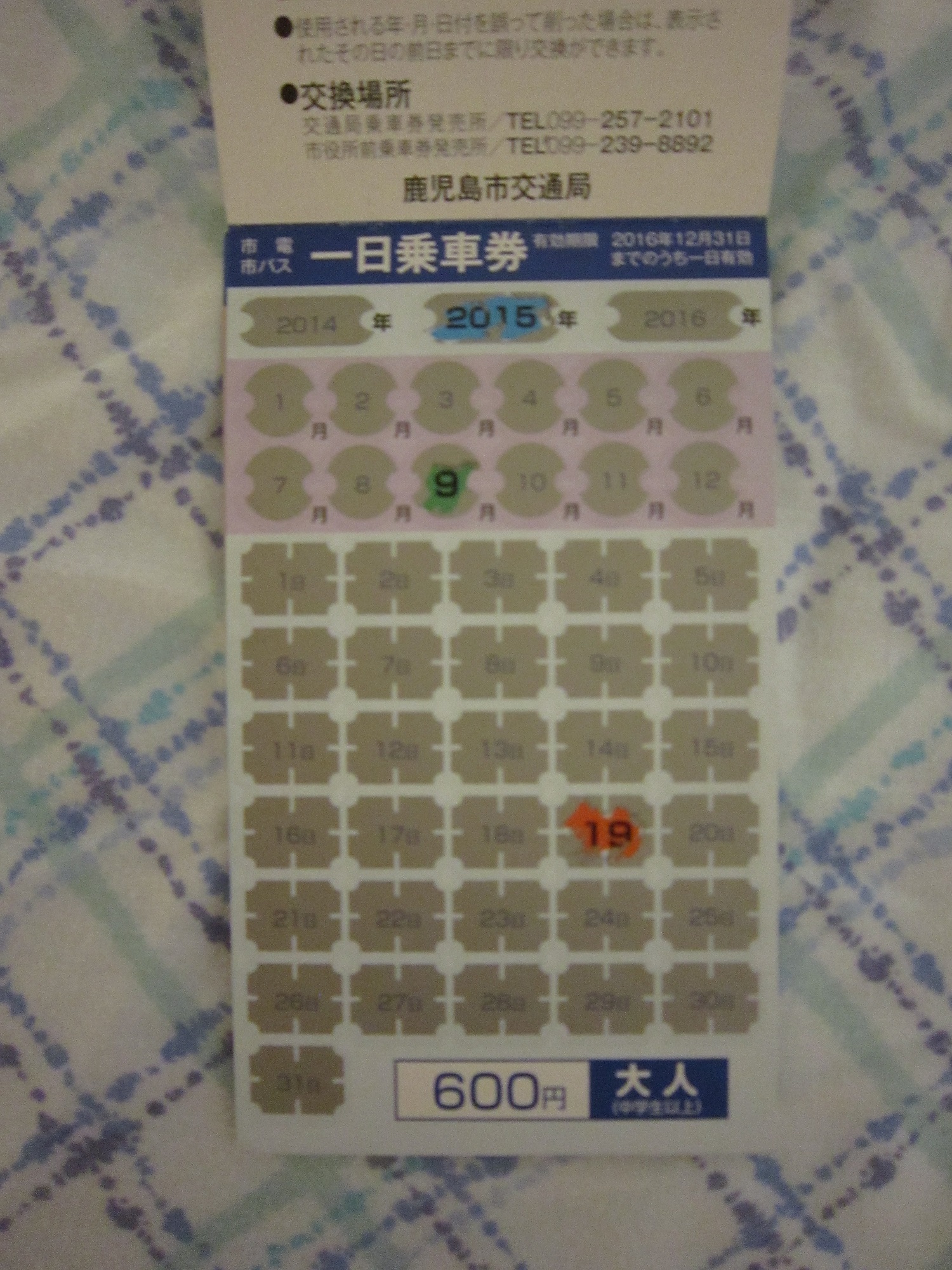 これが、一日乗車券です。乗車日をスクラッチして、市電とか市バスとかを乗り降りするときに、運転手さんに見せます。ただし、気を付けなければいけない点として、鹿児島市内を走るバスって、鹿児島市交通局のバスだけではないんです。例えば、鹿児島市内から枕崎方面に行くバスがあるのですが、これは鹿児島交通のバスなので一日乗車券は使えません。なので、鹿児島市内といえど、区間によっては市バスじゃないバスが走っているので、一日乗車券が使えないケースがあるので、ご注意ください。