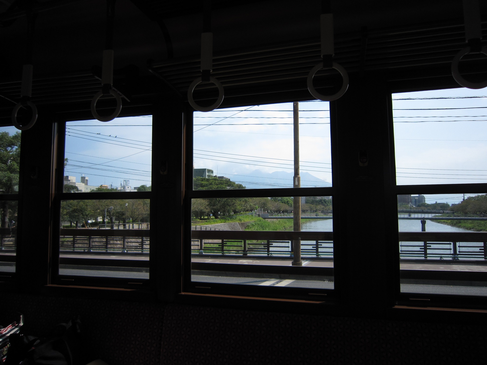 観光電車からも、桜島が見えます。ただし、今日はあんまりきれいに見えませんでした。