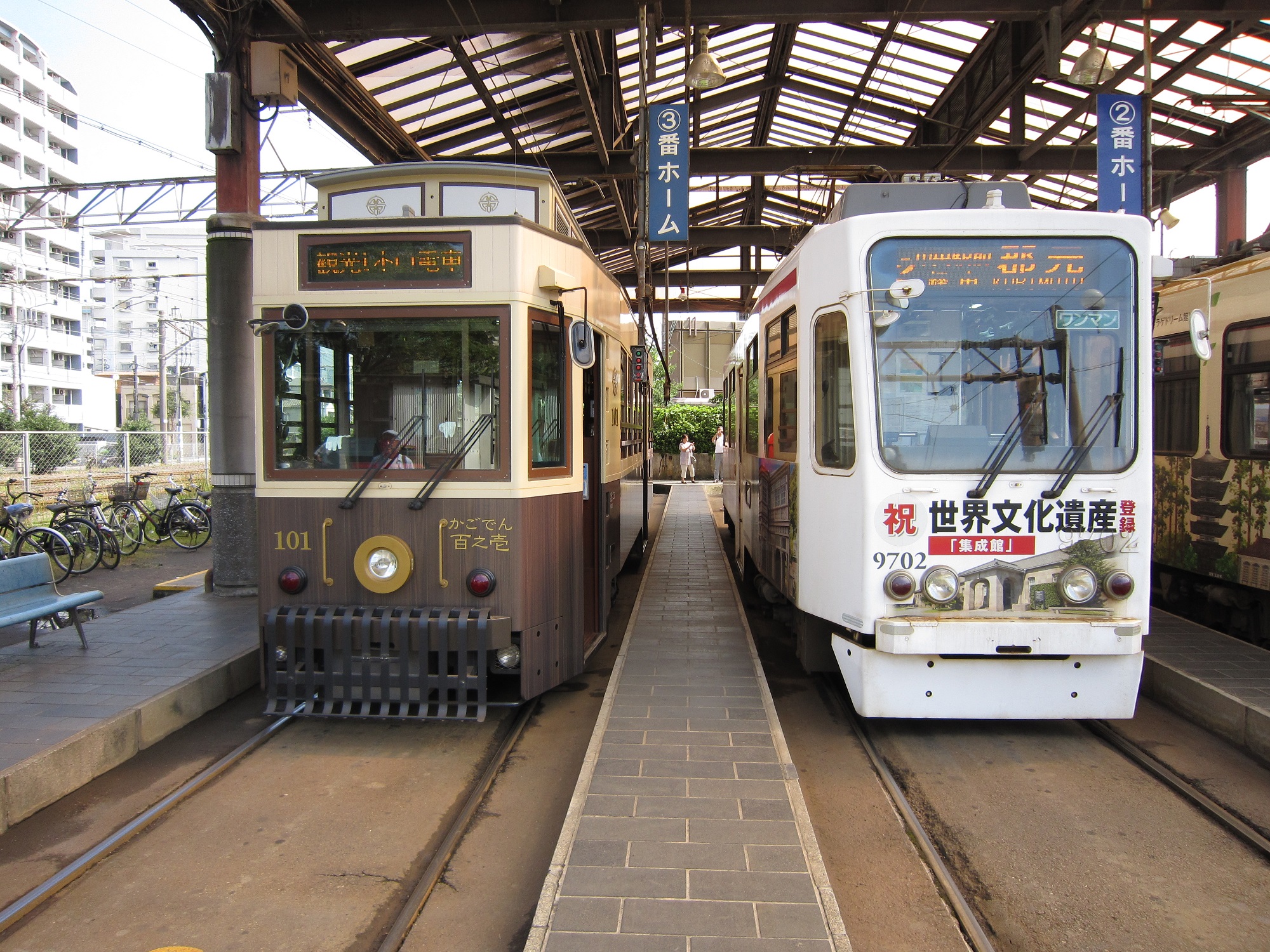 電車は鹿児島中央駅を出た後、天文館通を通って、鹿児島市駅まで行きます。で、鹿児島市駅の電停で、5分ほど停車します。ここで、記念撮影なんかができます。鹿児島市駅を折り返して、天文館通、騎射場、郡元と順にぐるりと1周して、鹿児島中央駅に戻ってきます。大抵の人はぐるりと1周するのですが、ガイドさんに言えば水族館前で降ろしてくれます。