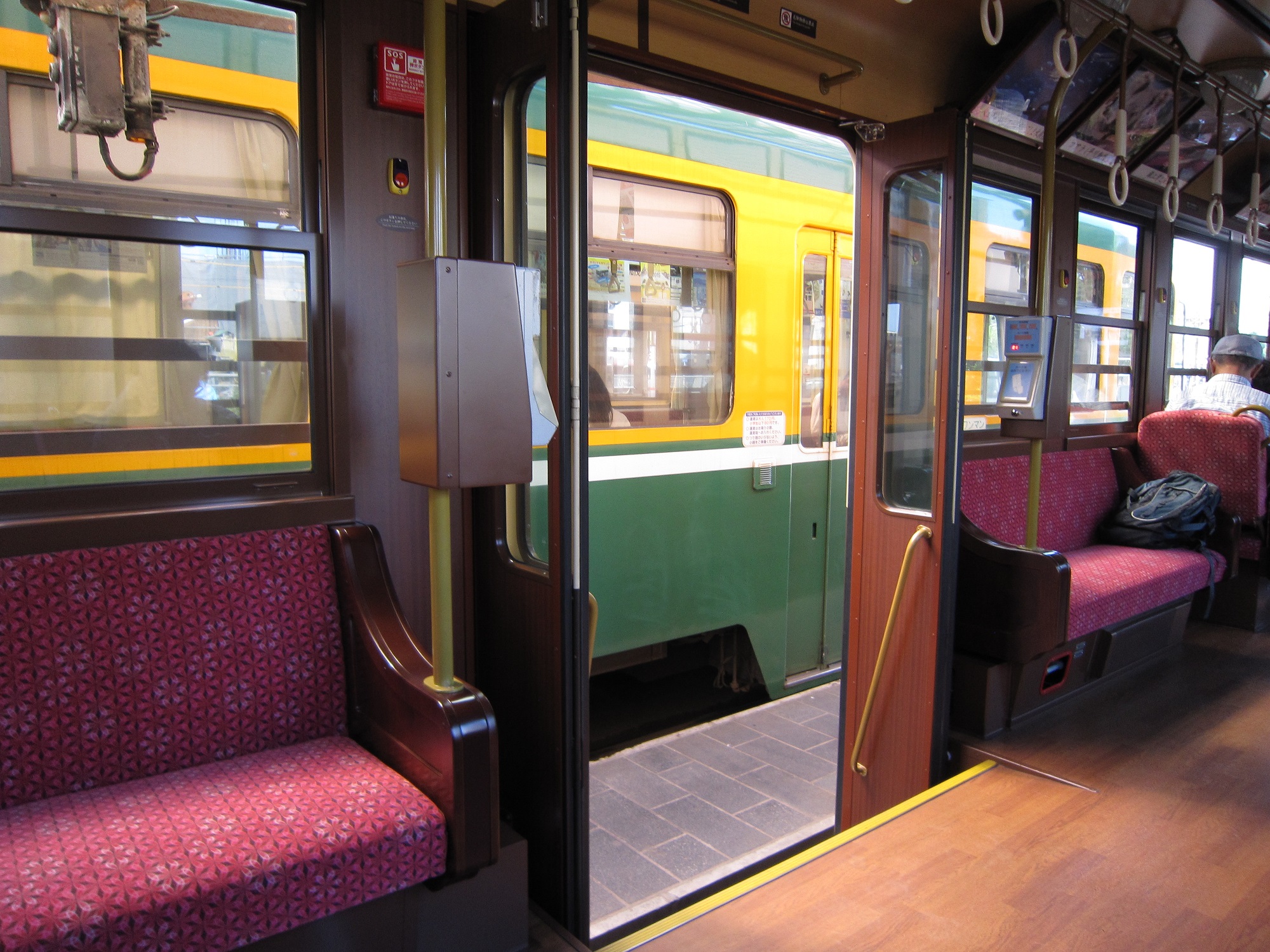 車内はこんな感じです。レトロ電車だけあって木目調で、出口の近くにガイドさんが立って案内できるよう、マイクがついています。また、進行方向を向いて座れるようになっているシートもあります。やはり市電には違いないので、両端の運転台にはICカードリーダーと運賃箱がついています。ただし、SuicaやSUGOCAは使えません。ま、この電車に乗るんだったら1日乗車券を買った方がいいと思います。