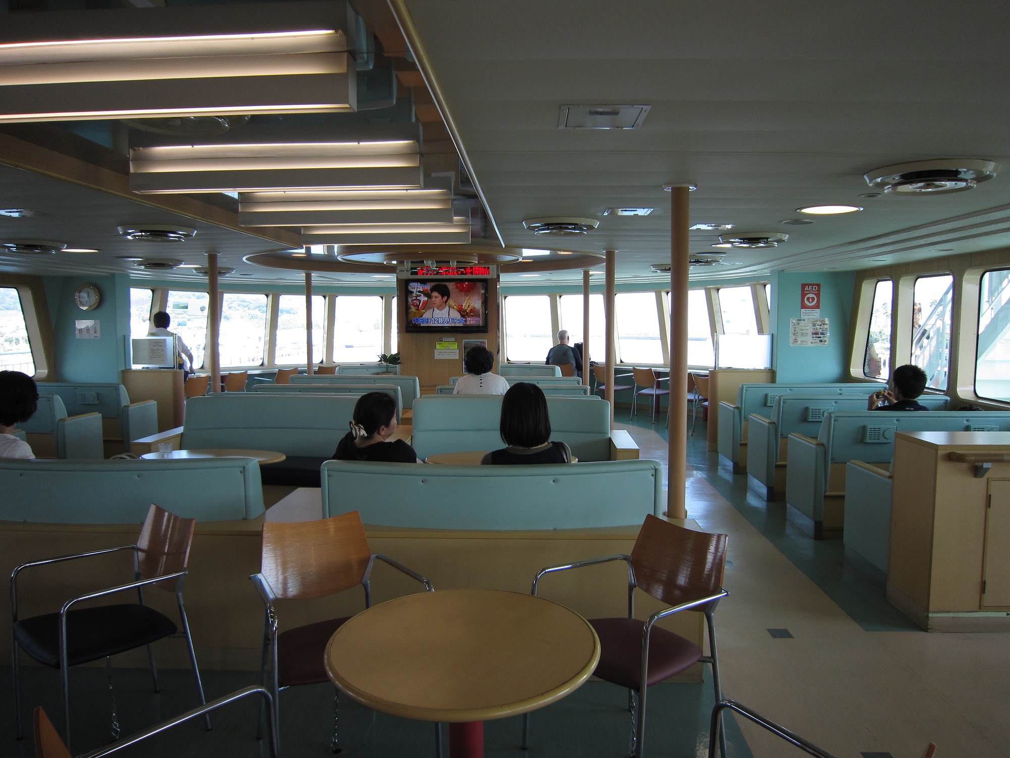これが、桜島フェリーの船内です。フェリーといってもいろいろなタイプの船があるらしく、これは比較的新しい船らしいです。座席は、桜島方向を向いています。