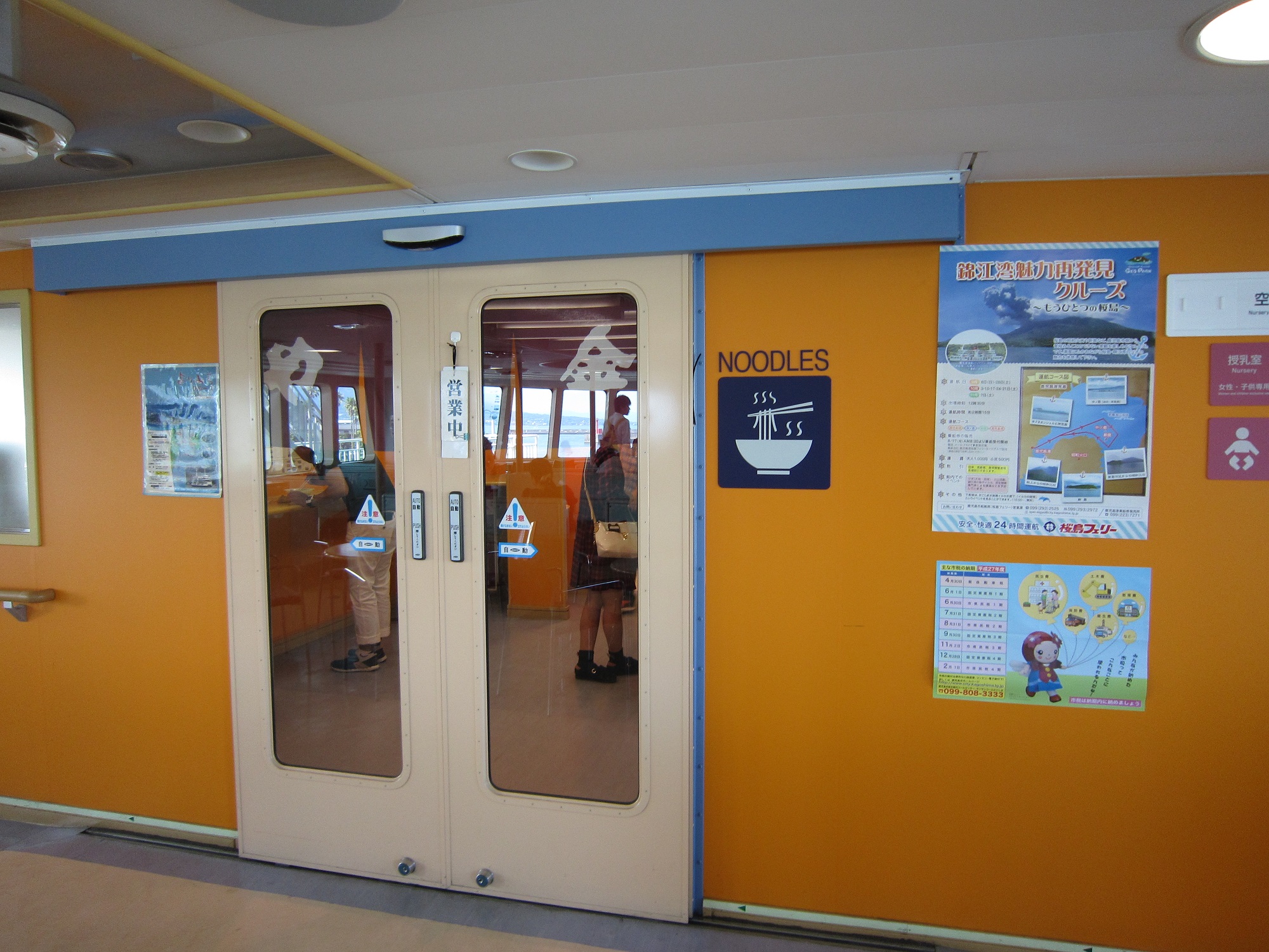 船内には売店のほか、立ち食いそば屋さんがあります。航行時間はおよそ20分でして、おそばを食べるといってもビミョーな時間ではあります。それでも、鹿児島・桜島両フェリーターミナルには食べるところがないので、それなりに意義はあるんだと思います。