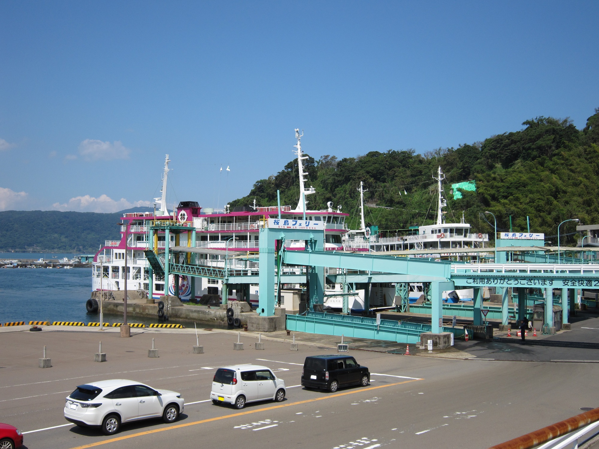桜島のフェリーターミナルです。鹿児島市内へ行く車が、すでに列を作っています。正しく言うと、桜島は本州と陸続きではあるのですが、鹿児島市内へ行くにはフェリーに乗った方が早いので、こうしてフェリーに乗る車がいるというわけです。ただし、フェリーといっても宮島連絡船をちょっと大きくしたぐらいです。