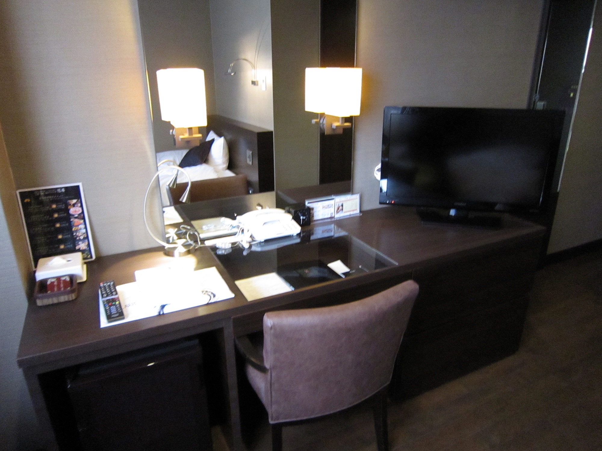 デスク周りです。左側に冷蔵庫と空気清浄機、右側にテレビが置いてあります。一応時計も置いてあるのですが、部屋が暗いと見づらいので、気になる人は目覚まし時計を持って行った方がいいと思います。また、テレビは32型と十分大きいのですが、ベッドから寝っ転がって見づらいところに置いてあるのが残念です。