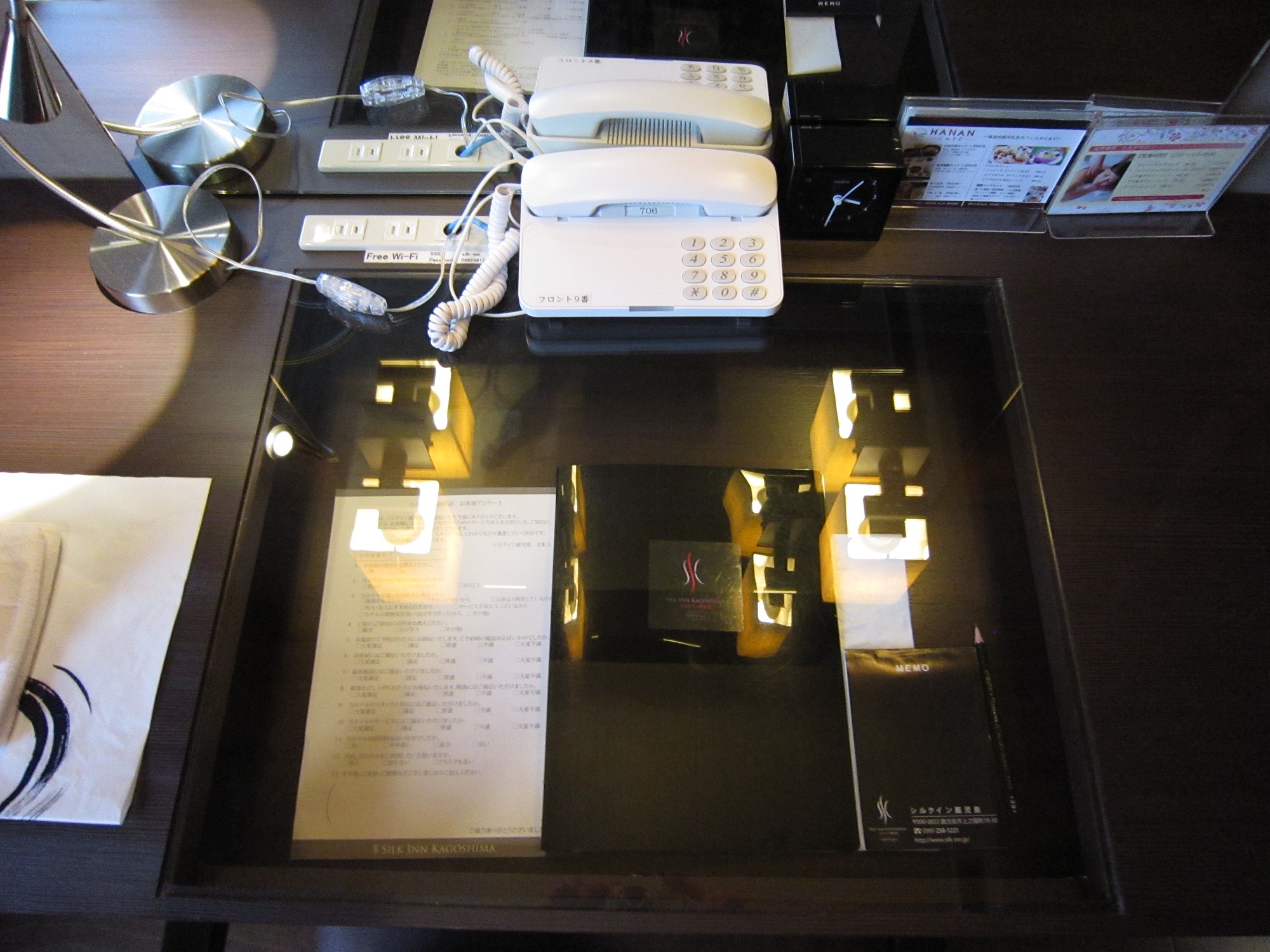 注意点が3点かありまして、1つ目はデスクがガラス張りになっているという点です。有線と無線のインターネットが利用できるのですが、デスクがガラス張りだとマウスがうまく作動しないので、PCを使う人はマウスパッドか何かを持って行った方がいいと思います。