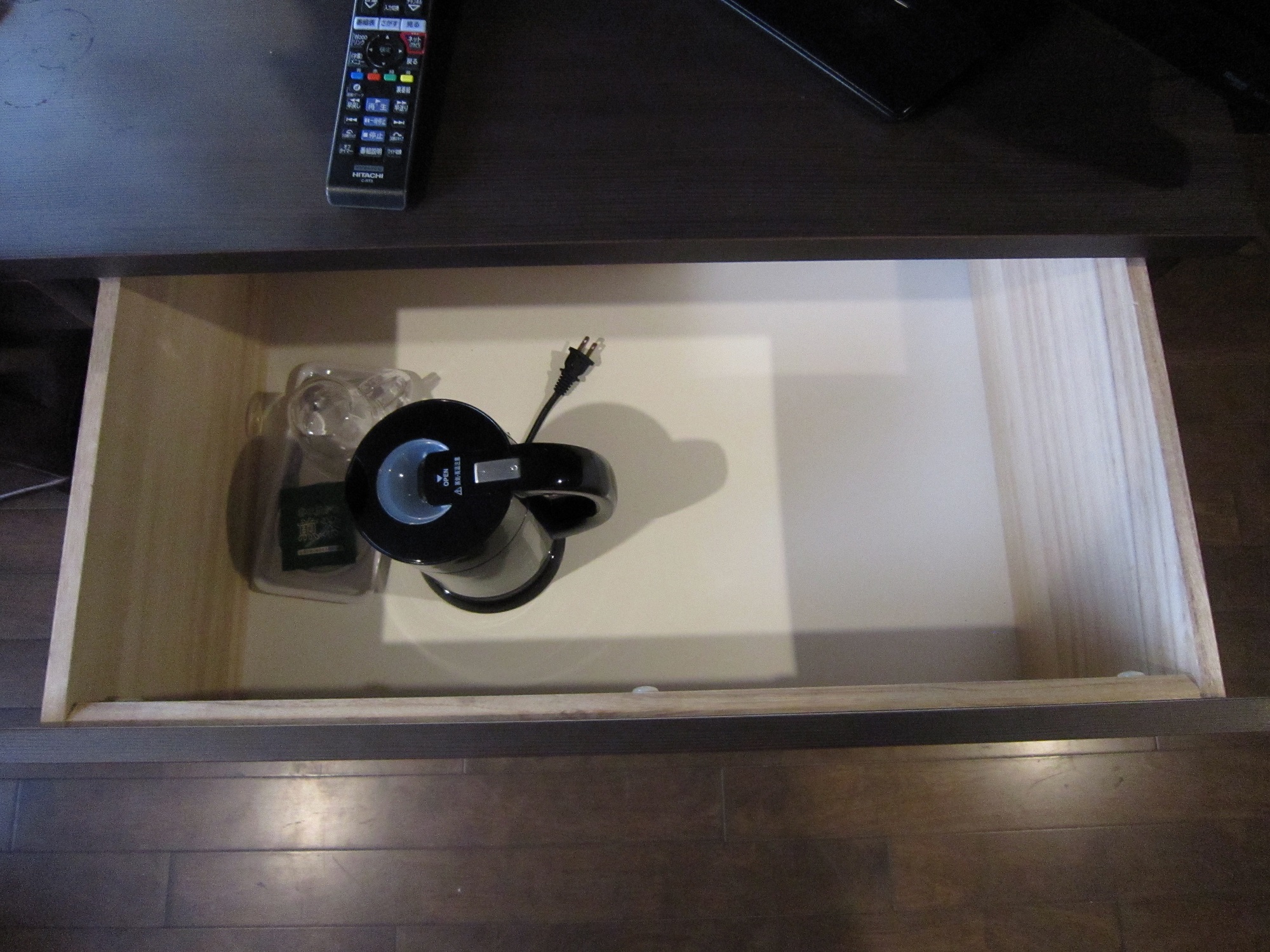 コップが見当たらないので、どこにあるのかと思ったら、引き出しの中にありました。電気ポットも同じところに置いてあります。