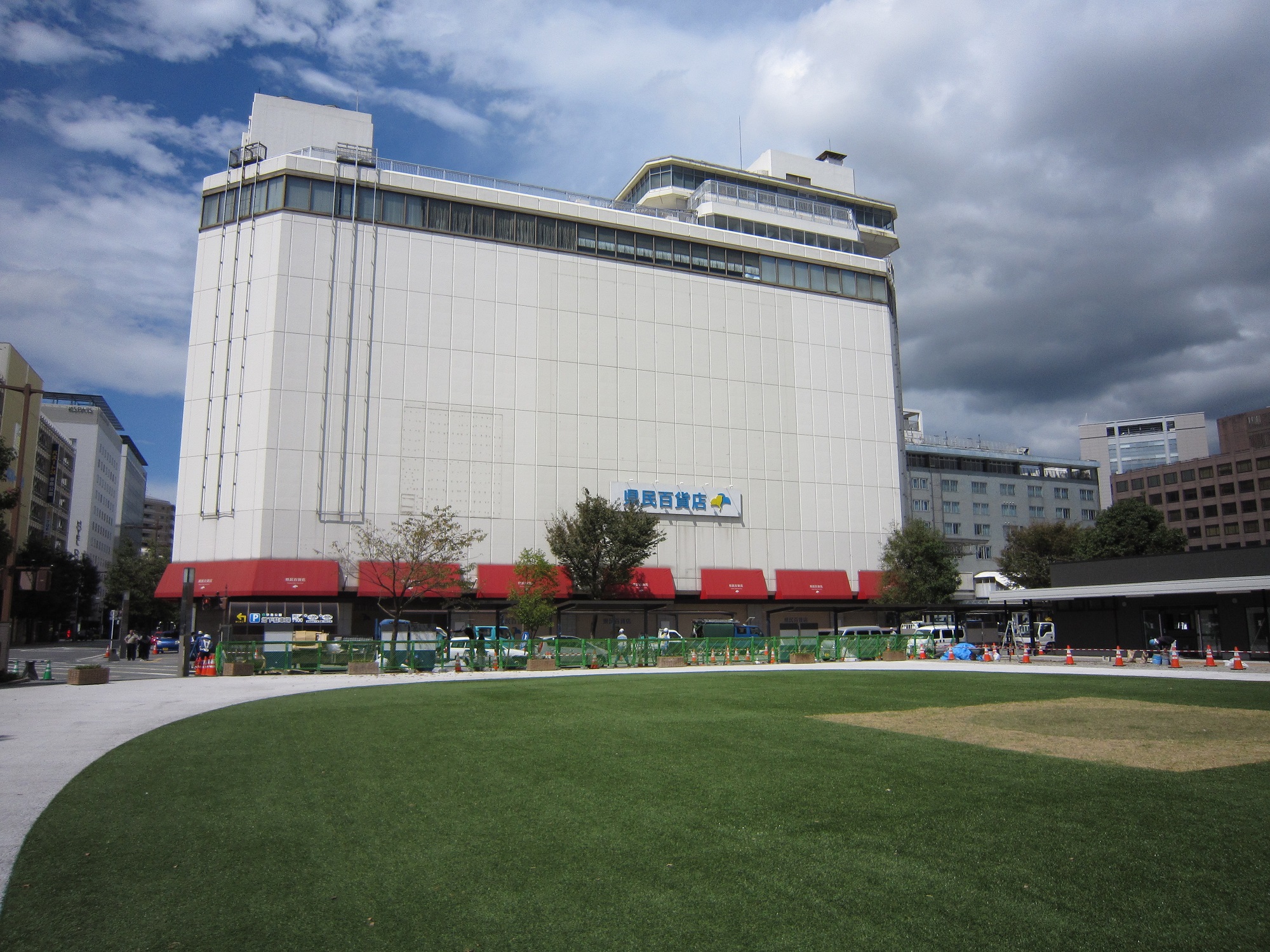 熊本交通センターに隣接して、県民百貨店があるのですが、こちらもすでに閉店していました。どうやらこの辺一帯を再開発するらしく、まずは熊本交通センターとセンタープラザ、県民百貨店を取り壊すつもりらしいです。そのため、仮設のバスターミナルを作っているみたいです。