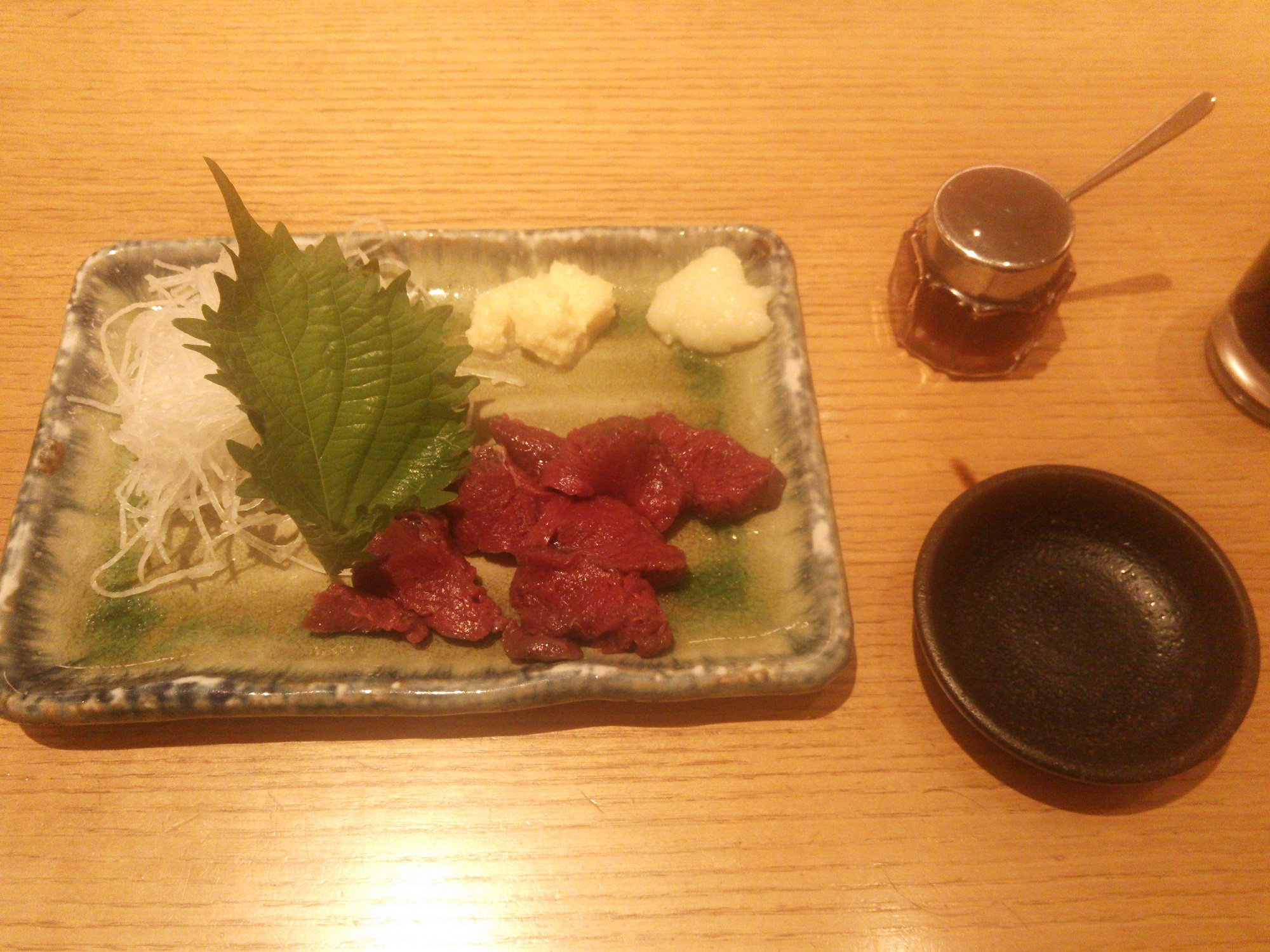 ・・・で、お風呂上がりの飲みです。この手の施設には珍しく、馬刺しがあったので頼んでみました。700円です。生姜、ニンニク、コチュジャン、醤油の中から、お好きなものでいただきます。キューティー吉本は、ニンニクと醤油で頂きました。もちろん、本場の熊本県とは比べるべくもないのですが、臭みは全くなく、脂も乗っててうまかったです。