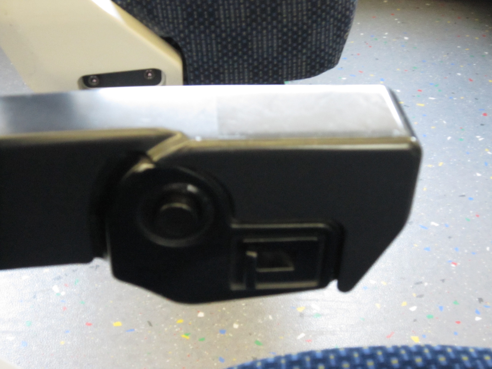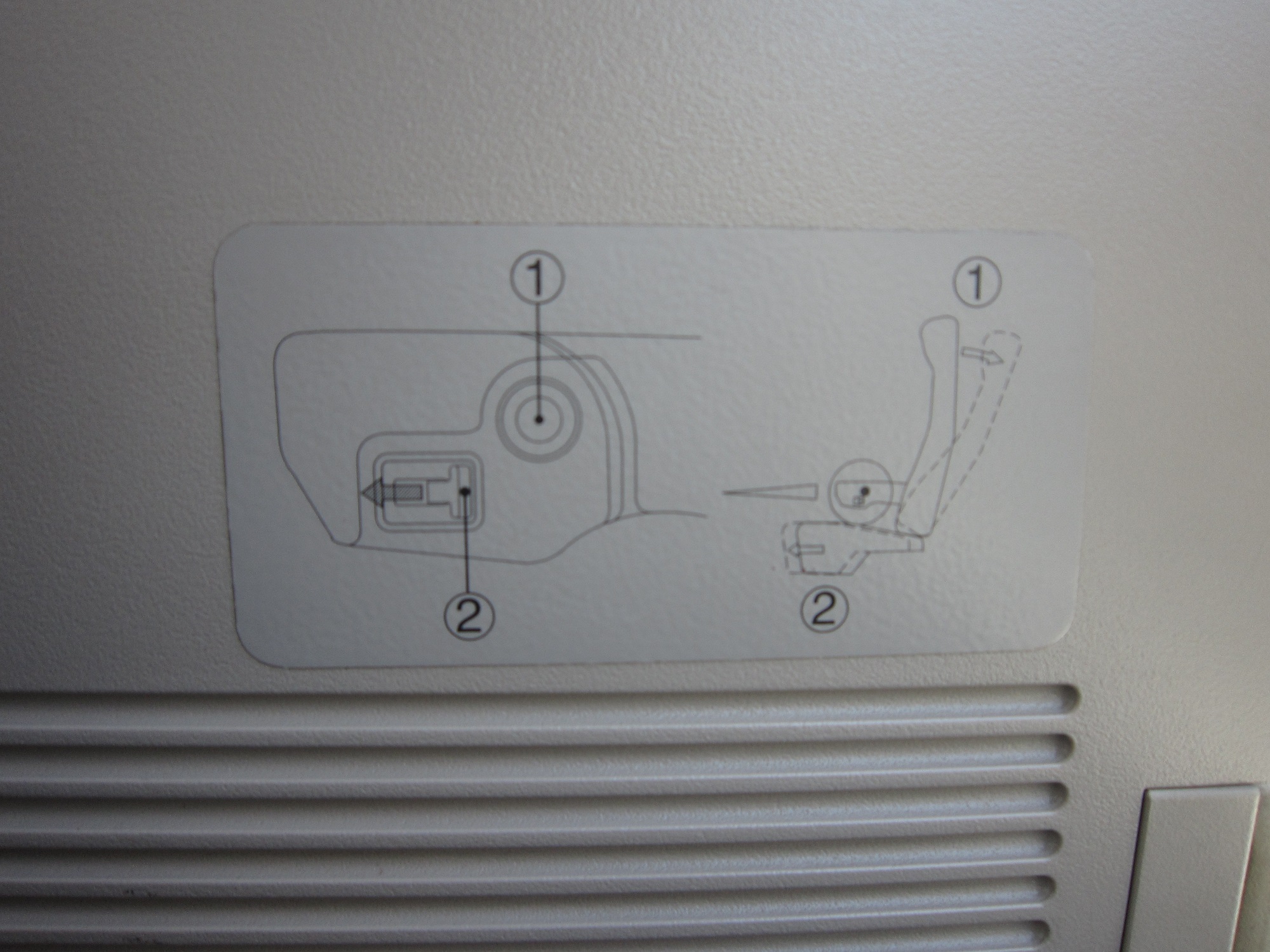 肘掛けには、シートのリクライニングボタンと、座面のスライドボタンがついています。テーブル背面に、説明書きがあります。