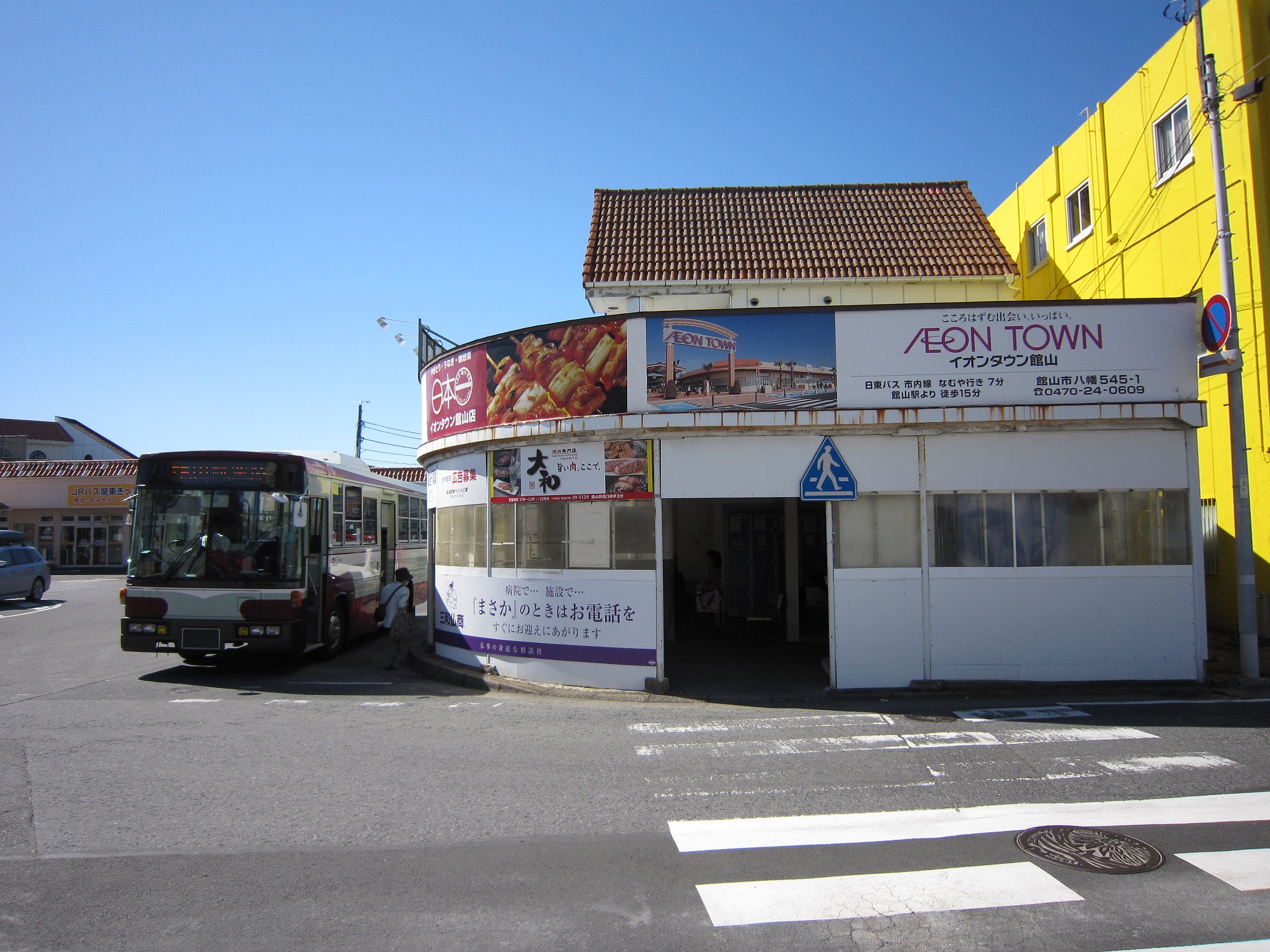 なんと、やや離れたところにある茶色い屋根の建物が、館山日東バスのバス乗り場だったのでした。うーん、これはわかりにくい。早速中に入ってみると・・・