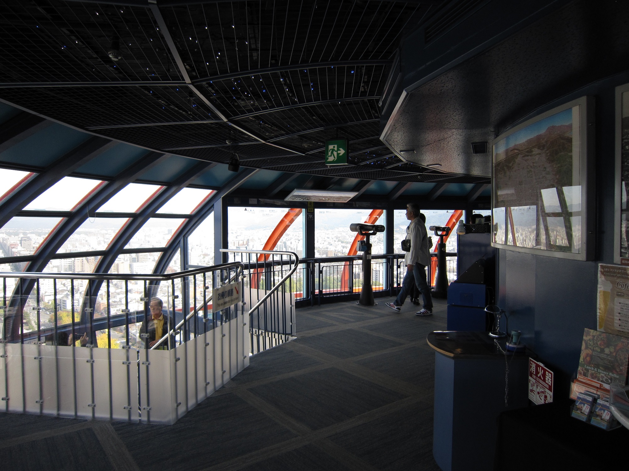 エレベータは、展望室5階に着きます。展望台お決まりの、双眼鏡が並んでいます。なんと、無料です。うーん、太っ腹。もっとも、ここへ行くまでに入場料を取られているんですけどね。