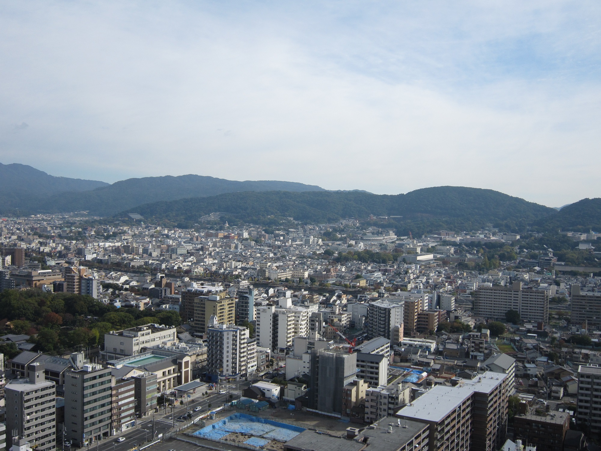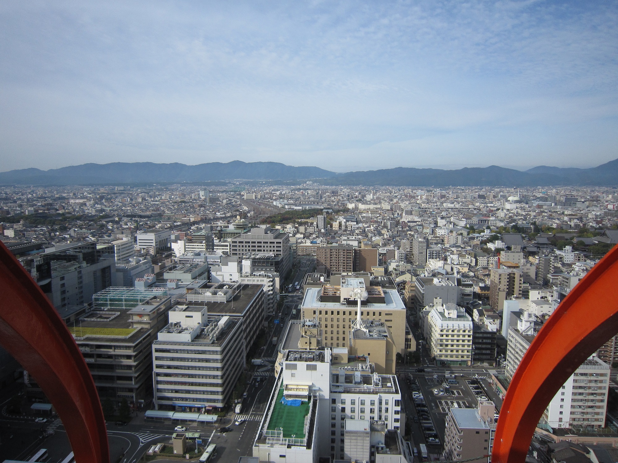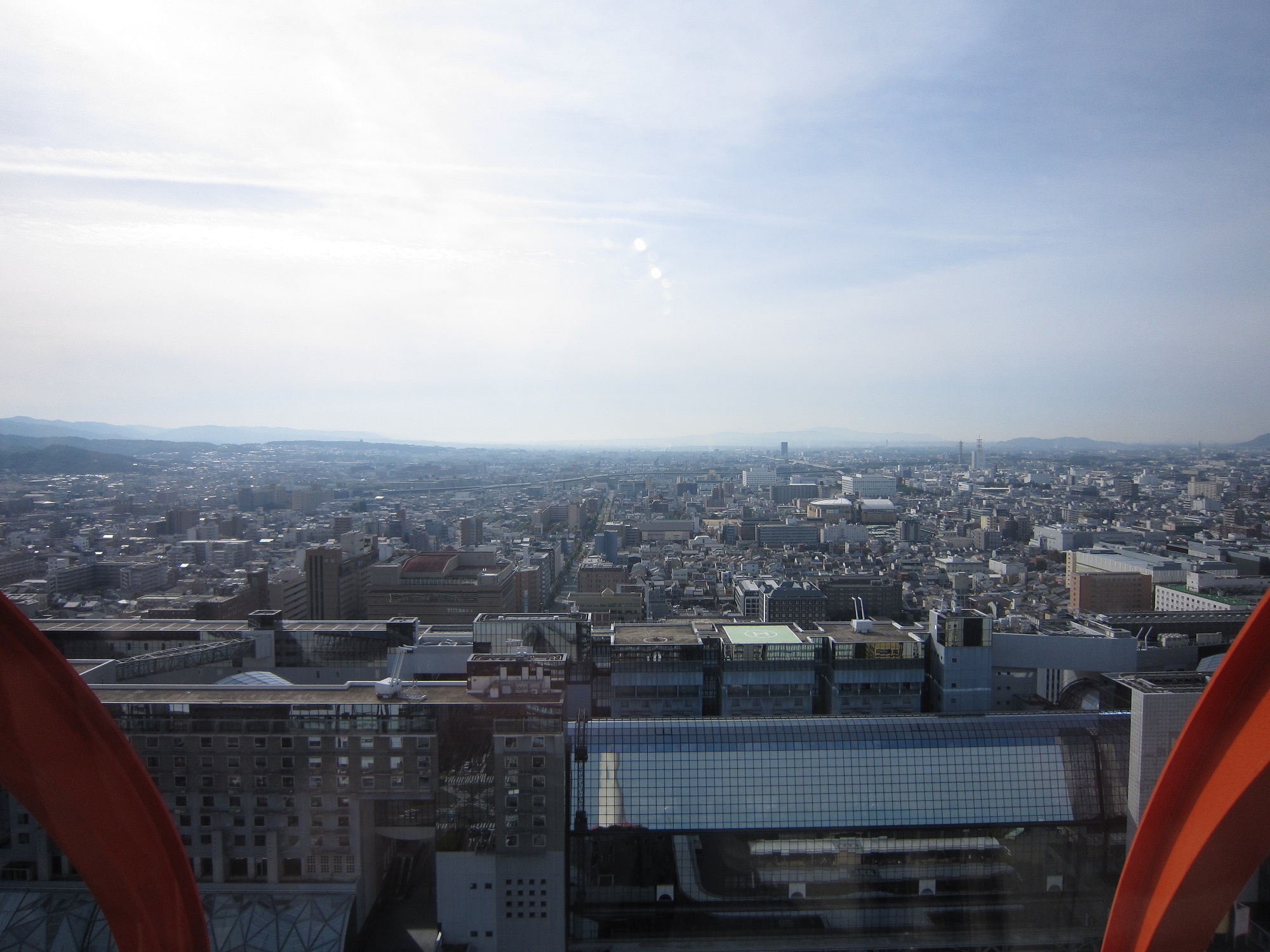 展望室からは、京都市内を上から一望できます。これは、西側を撮影したもの。京都タワーの特徴でもある、赤くてまあるい枠が、ちょっと邪魔だったりします。本当はこの枠に従って、曲面ガラスを入れるつもりだったのですが、曲面ガラスだと景色が歪むとの理由で断念したそうです。
