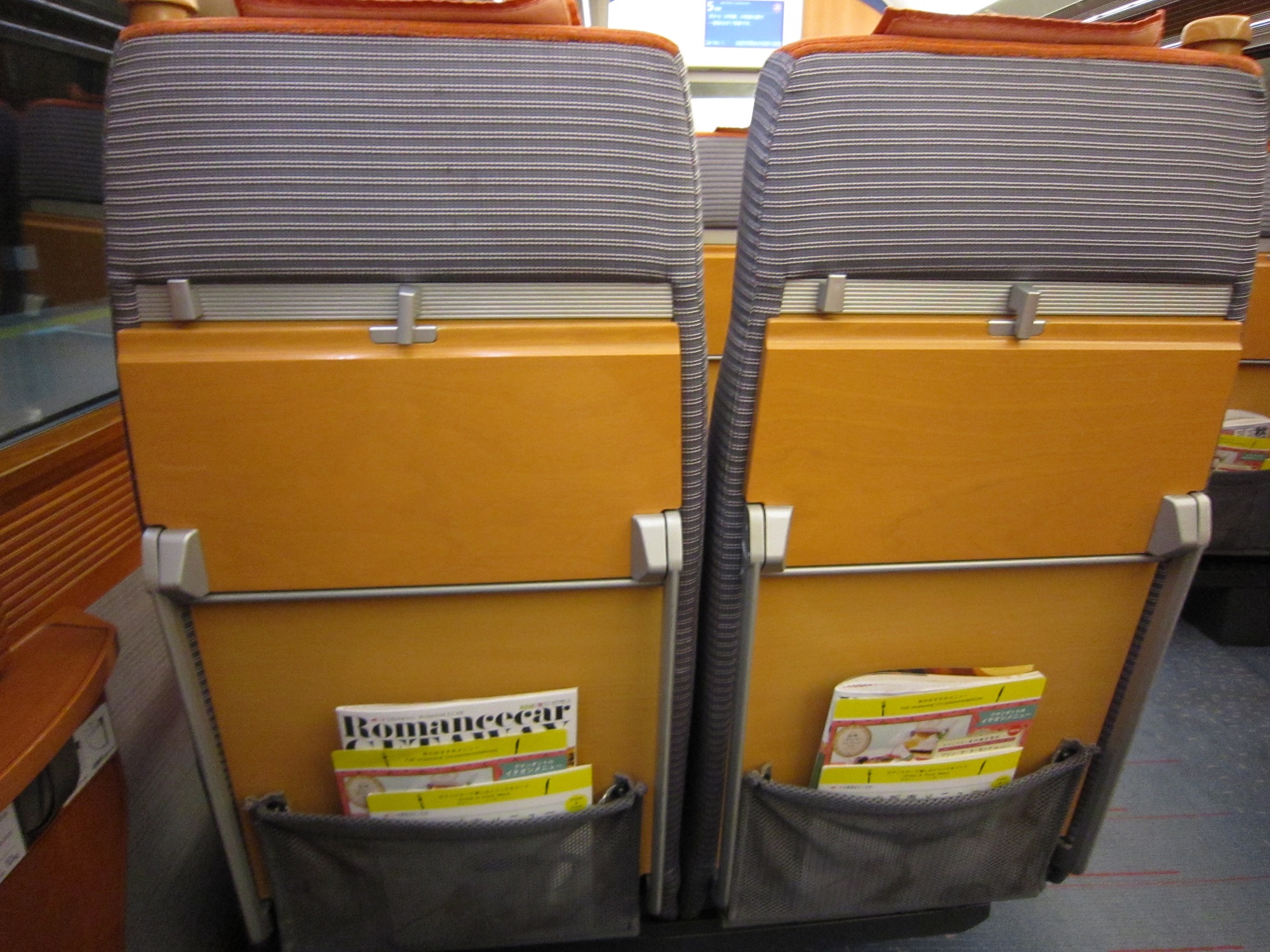 シートがちょっと変わっていて、若干窓側を向いています。室内は木材を多用していまして、落ち着いた感じになっています。シートはオレンジ色なのですが、温かみがある感じで好印象です。