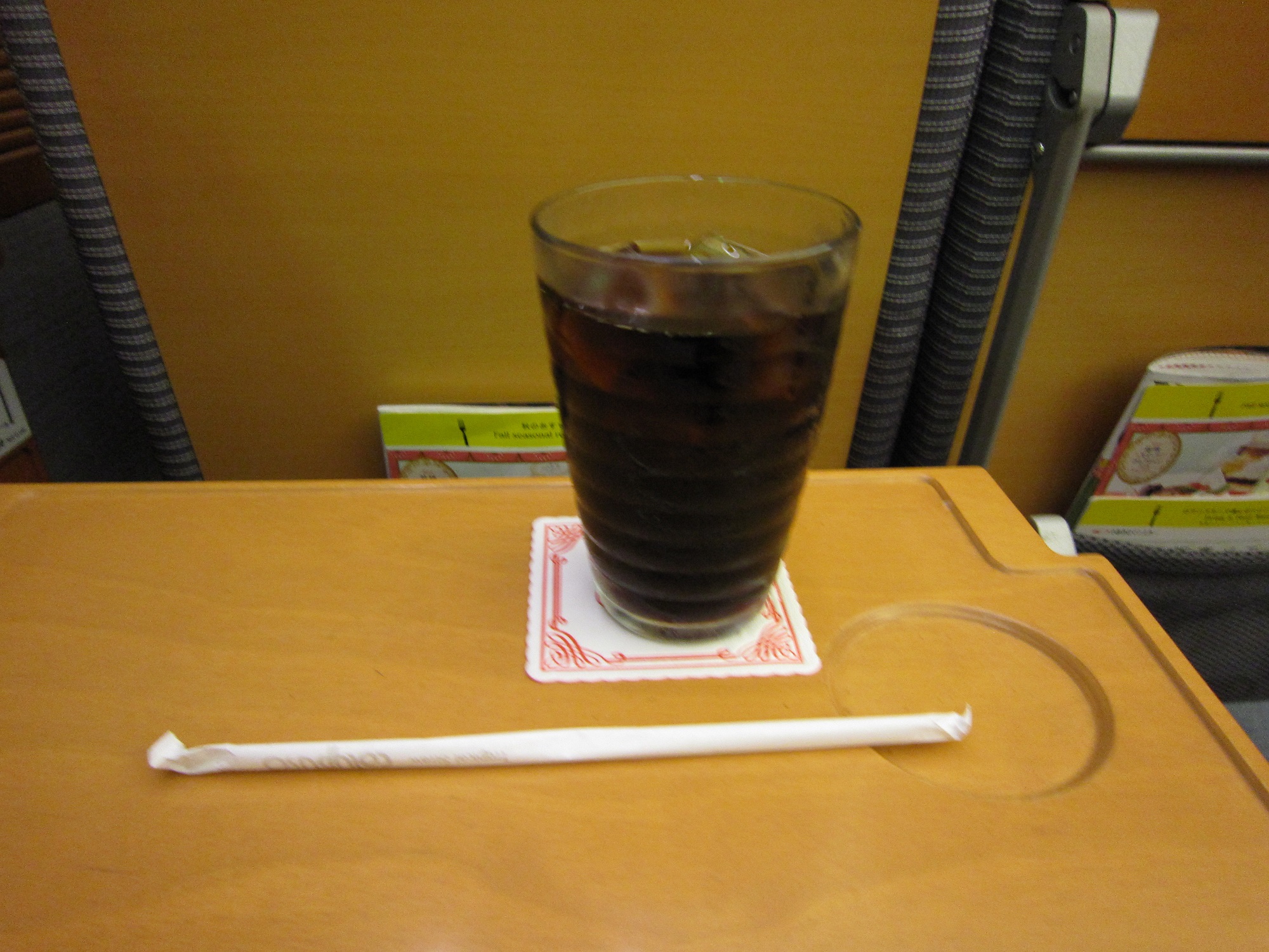 ・・・で、アイスコーヒーを頼んでしまいました。320円です。何と、ガラスのコップに入ってました。ただ、細かいことを言うと、コースターのサイズがビミョーで、丸くくぼんだ部分に入らないんです。本来はここに飲み物を入れると思うのですが。