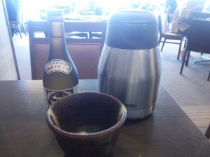 出てきた芋焼酎がなんとこれ。900mlのボトルに入った芋焼酎 さつま司と、お湯が入った魔法瓶でした。いや、これグラスにして2~3杯分はあると思うんですけど。
