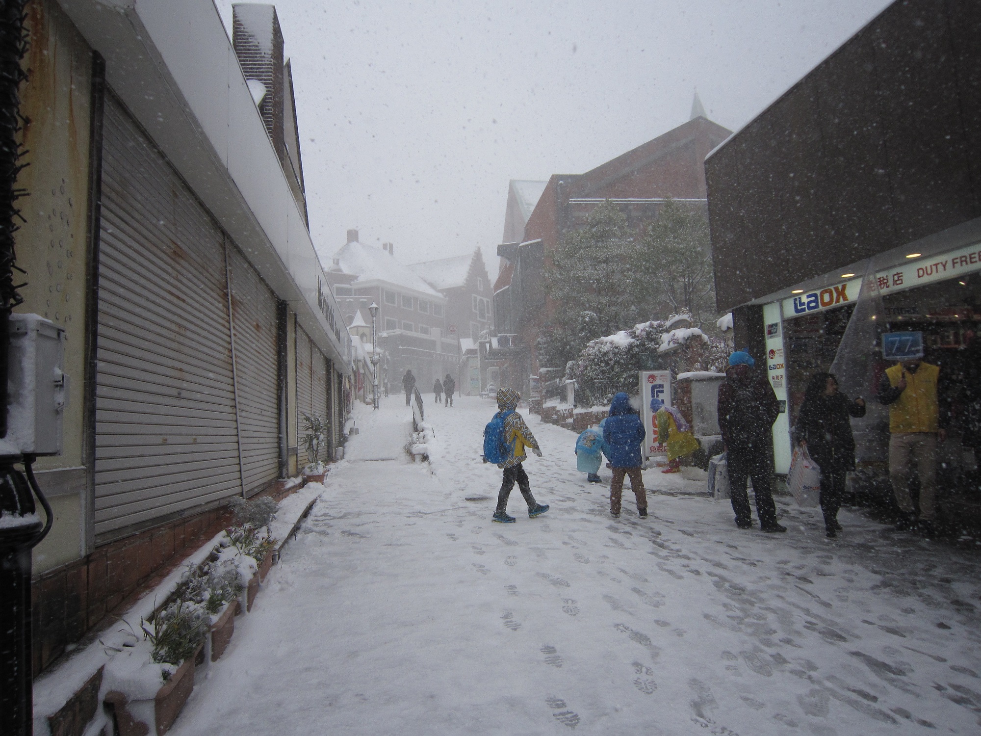 大浦天主堂へ行くには、ANAホテルの裏にある、坂を昇っていきます。ここはお土産物屋さんがずらりと立ち並ぶのですが、今日は閉店のお店が多かったです。ま、これだけの大雪で観光客はあんまりいなくて、しかも交通機関のダイヤが乱れ・・・を通り越してJR長崎本線が終日運転見合わせ状態ですから、無理してお店を開けなくてもいいんじゃないかって感じです。