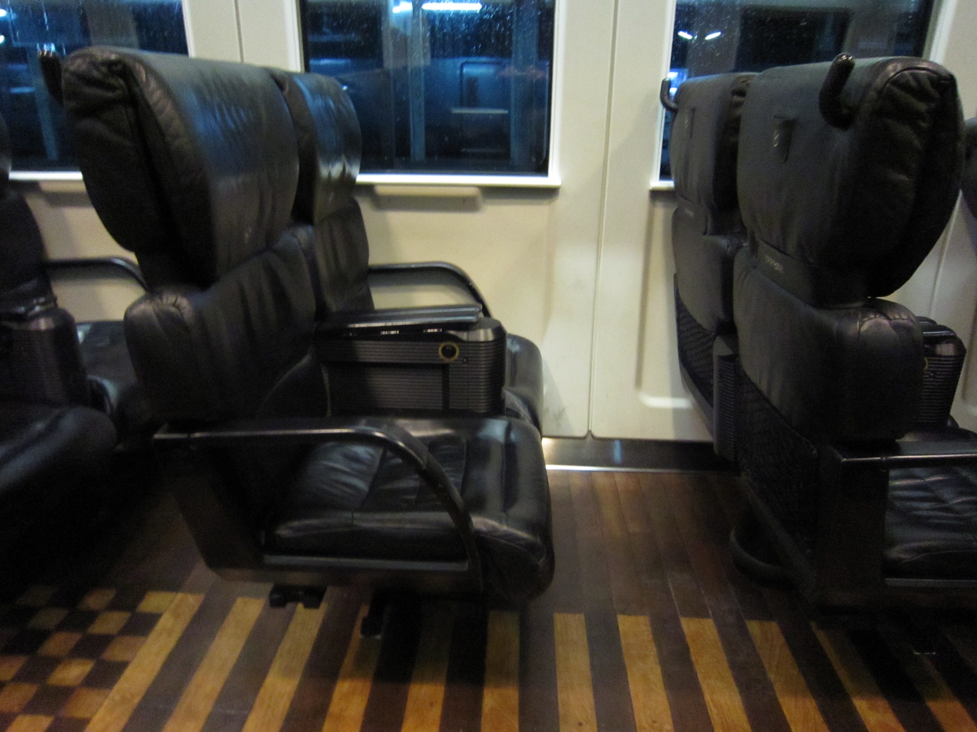 この車内に入って、一瞬グリーン車かと見間違えました。床がフローリングで、革張りのシート。未だかつてこんなゴージャスな電車に乗ったことなかったです。