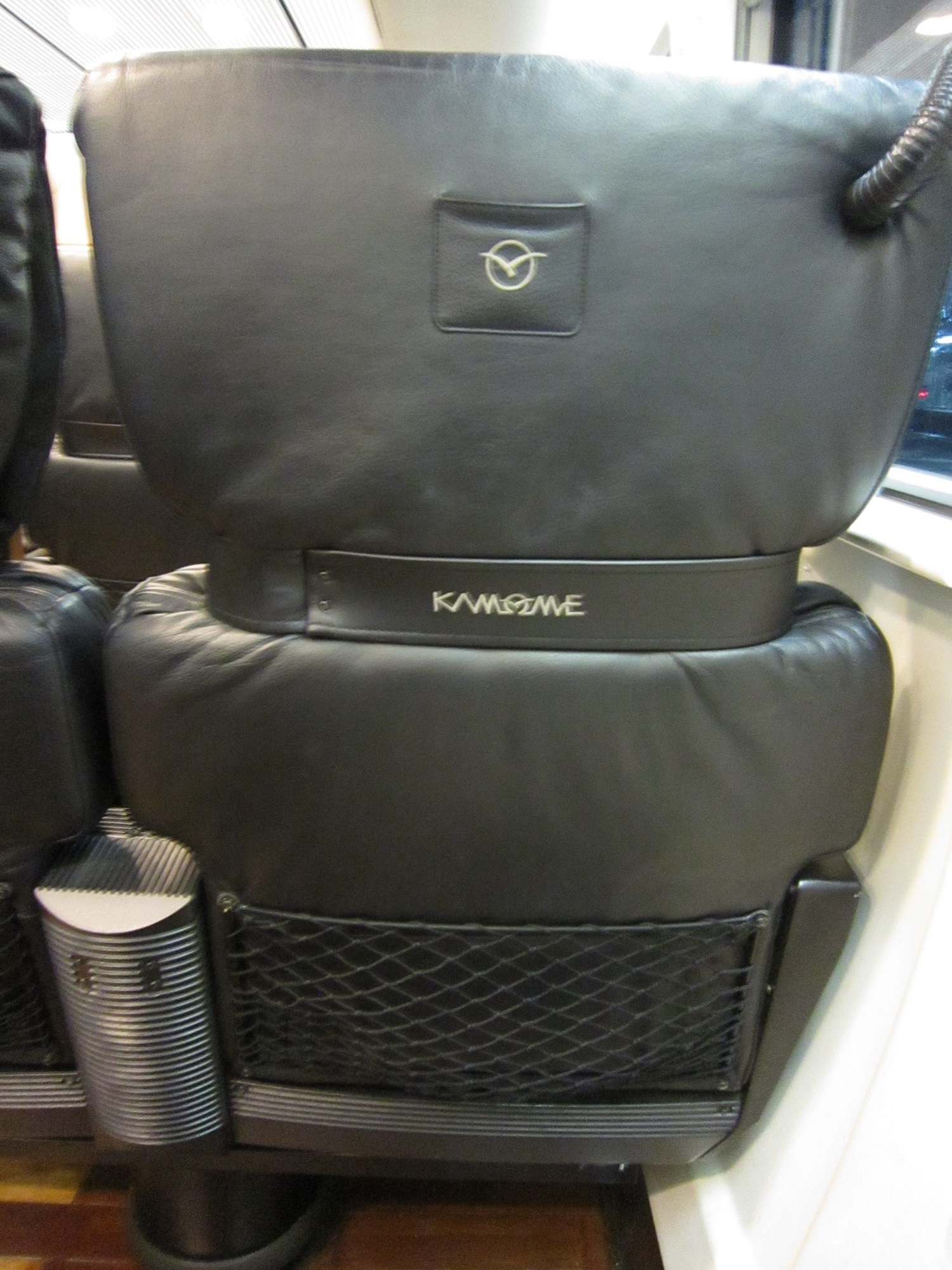 シートを横から見ると、こんな感じです。枕の部分がかなり大きくて、フカフカしてます。しかも、かなり角度にリクライニングできます。いや、某E社だったらグリーン車ですね、これは。
