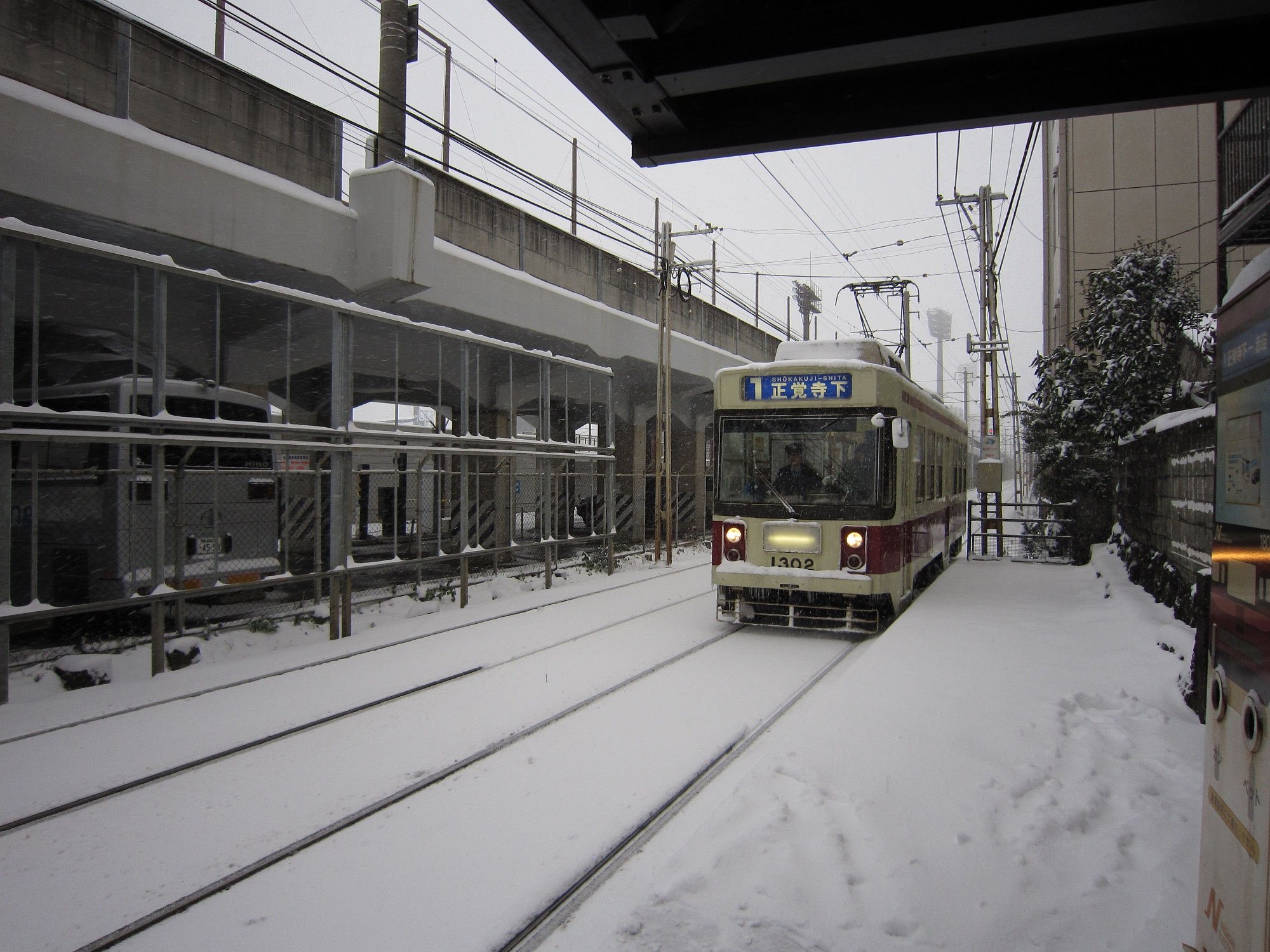 長崎電気軌道 1300型 大雪の長崎市内 松山町電停にて