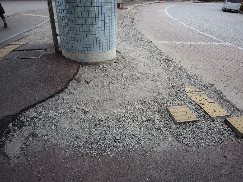 舞浜駅の階段を下りると、バスターミナルがあるのですが、ご覧の通りの状態です。液状化現象のせいだと思うのですが、柱のあるあたりが浮き上がって、アスファルトが波打ってます。