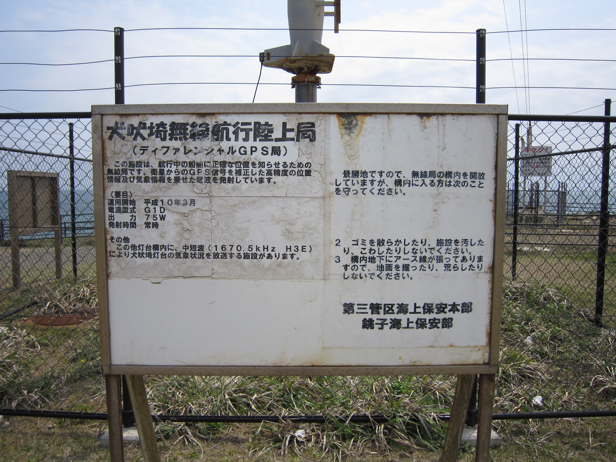 犬吠埼無線航行陸上局だそうです。この施設は、航行中の船に正確な位置を知らせるためのアンテナでして、衛星からのGPS位置情報を補正するための信号と、気象情報を送っているのだそうです。ま、船に位置を知らせるための施設という意味では、灯台と役割は似ているわけで、うーんさすが関東最東端。