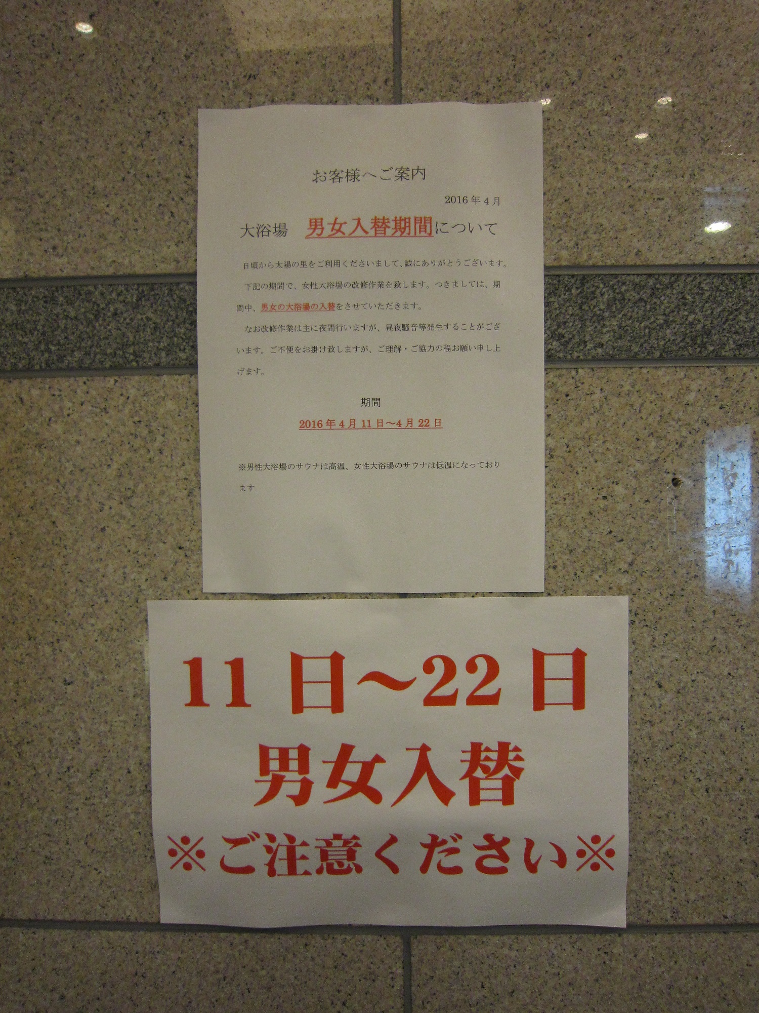 入り口に気になる掲示を発見。4月11日~22日は、男湯と女湯を入れ替えるそうです。理由は、女湯を工事するためだそうです。ま、確かに女性はどんなに入りたくったって男湯には入れないわけだし、男性はどんなに入りたくったって女湯には入れないわけですけどね。しかし、間違えて女湯に入ってしまった男性もいたとか。「確信犯じゃないの?」って突っ込みを入れるのはやめましょう。